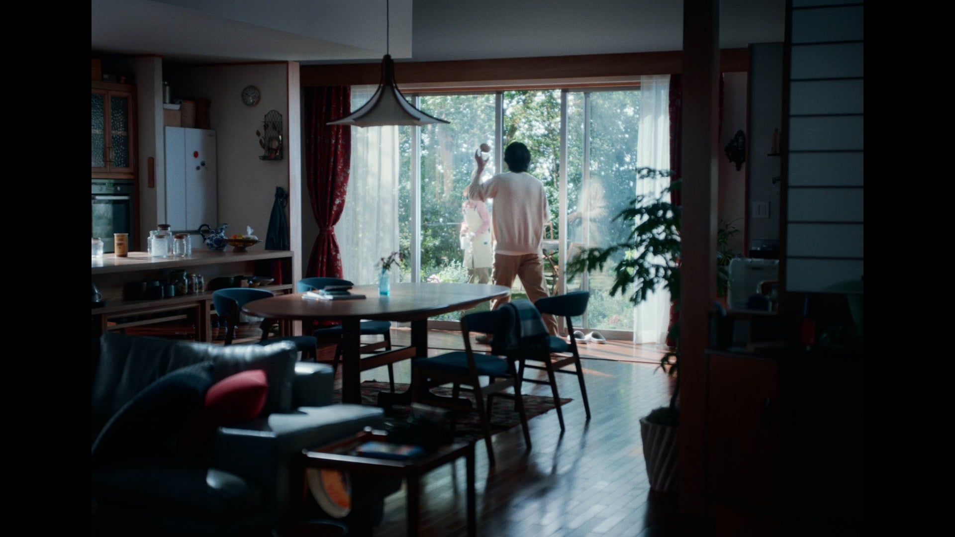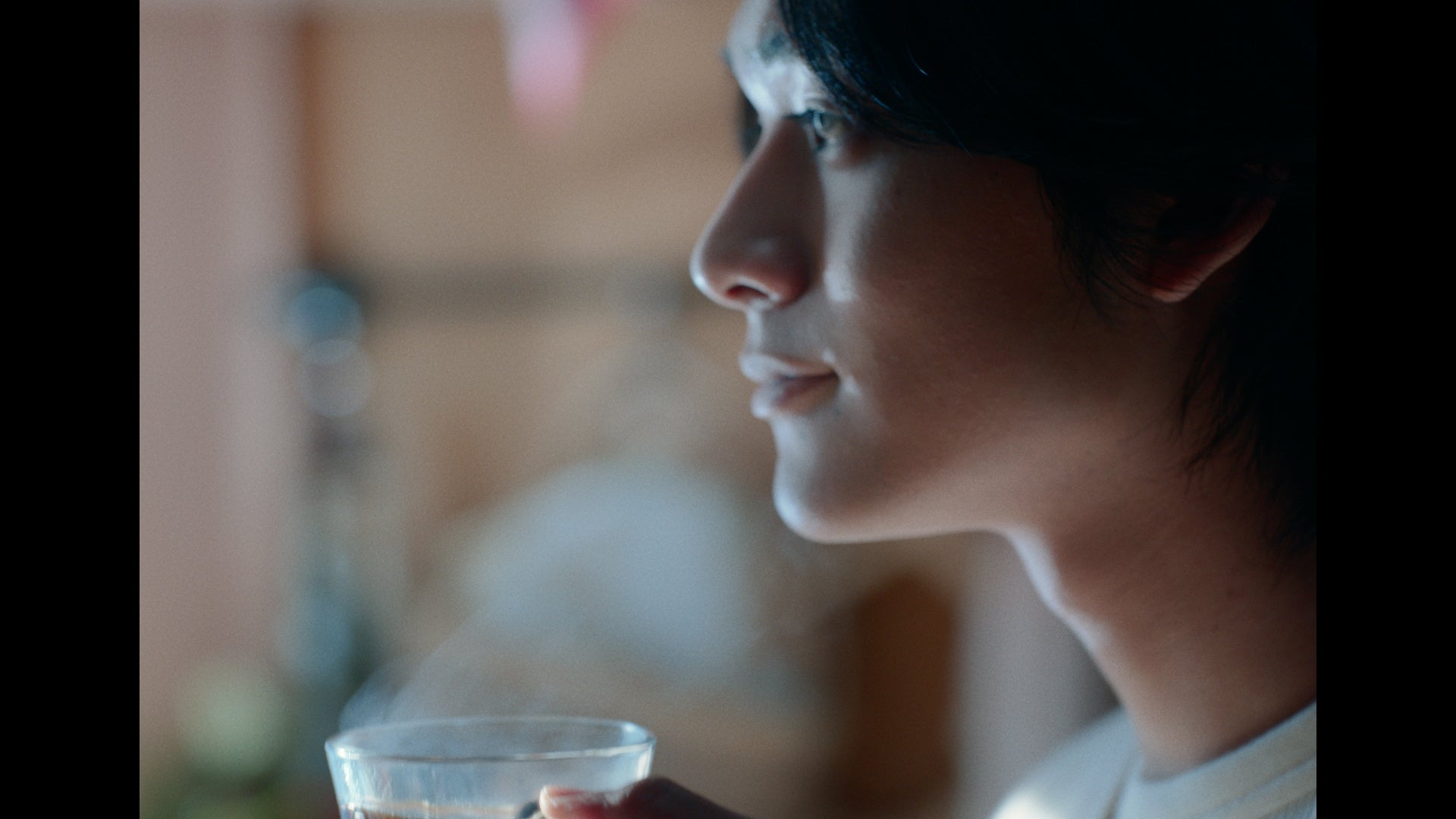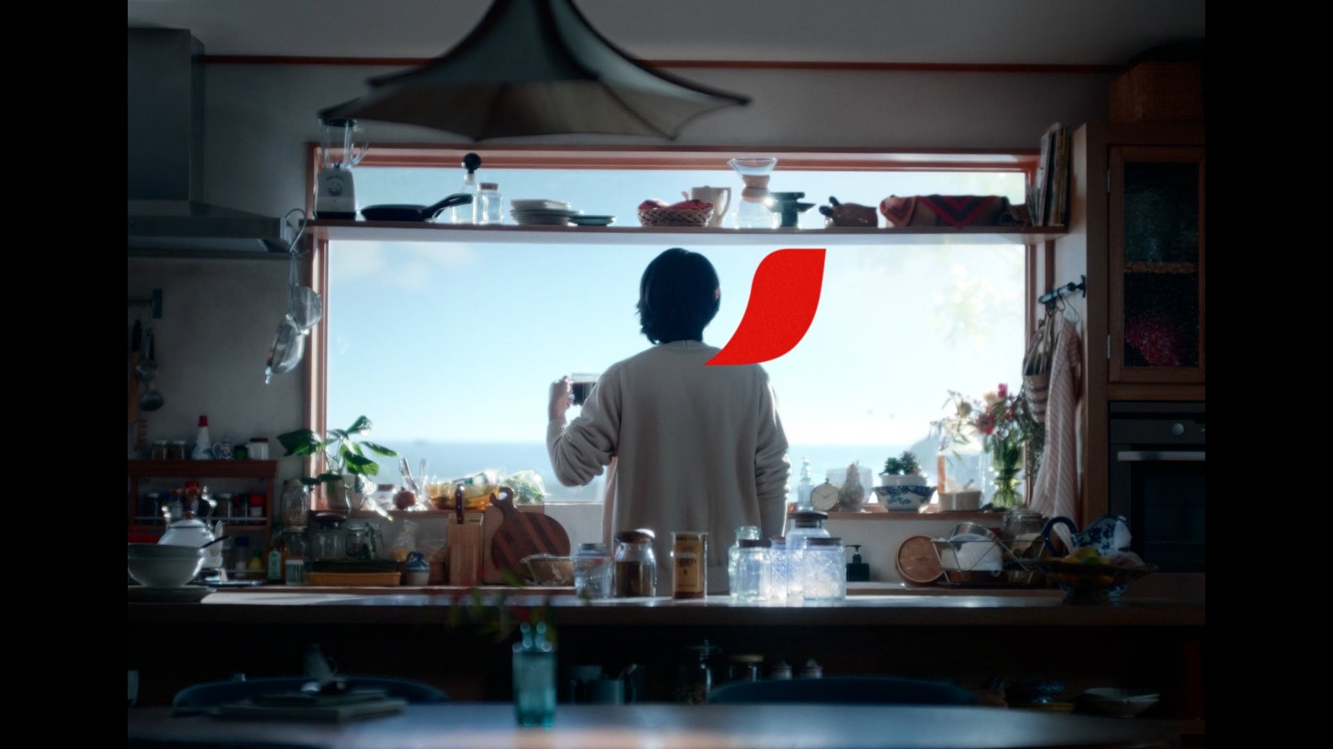 窓の外に青い空と海が広がる景色のいいリビングで、コーヒーブレイクをイメージしながら撮影に臨んだ北村さん。温かみのあるウッド素材を多用したインテリアを眺めながら、「家具や棚の雰囲気が自宅に似ている」と明かしました。撮影中は終始リラックスした表情で、待機時間も小さな椅子に腰かけてくつろいでいる姿が印象的でした。淹れたてのコーヒーを飲むシーンでも、自宅での休憩時間のようにゆったりとした表情で味わい、カメラが止まった後は手に持ったガラスのカップを顔に近づけながら、「いつもの味ですね。この一杯から一日が始まっている」と静かに語っていました。