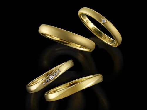 純金(K24)のもつピュアで深みのある輝きが優美なラインによって際立つデザイン。メレダイヤモンドなしのリングは一部ヘアライン加工。純金でこの柔らかいラインを日常使いできるように加工を施せるのはエクセルコならでは。