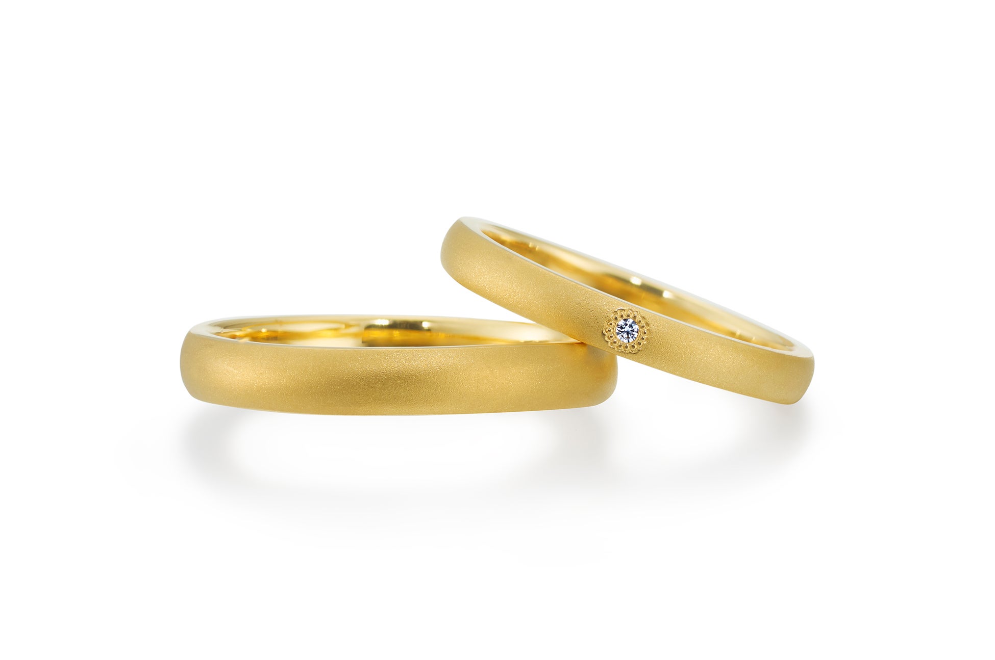 純金(K24)のもつピュアで上品な色味を引き立たせる細かなマット(ブラスト)加工を施したデザイン。メレダイヤモンドのセッティングはミルグレイン(ミル打ち)でアンティークな印象に。