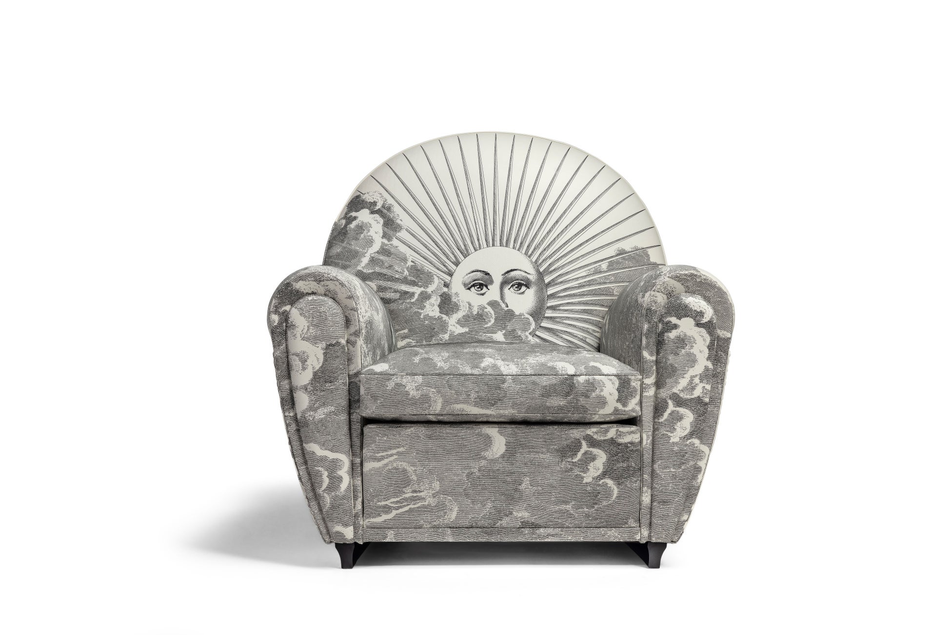 イタリアのデザインアトリエ「Fornasetti(フォルナセッティ)」とのコラボレーションから生まれた、シリアルナンバー入りの50脚限定モデル。アームチェア全体に描かれた渦巻く雲の上に昇る太陽と月が、フォルナセッティらしいミステリアスな世界観を見事に表現しています。立体感のあるシルクスクリーン印刷が施され、レザーの手触りに独特の質感をもたらす繊細なタッチが魅力です。フォルナセッティによって再解釈された「Imagine Edition」は、自由な表現の世界へと私たちを誘います。
