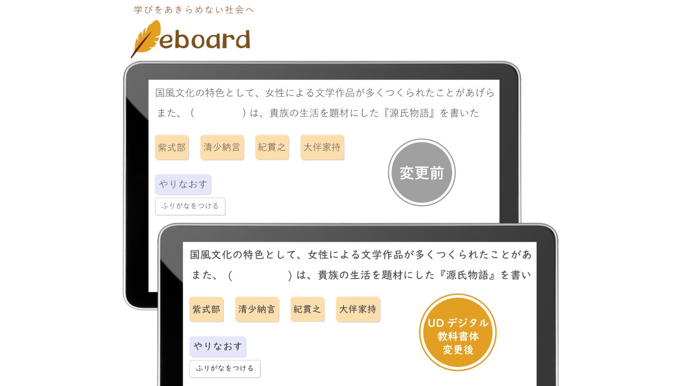 ICT教材eboardは、映像授業とデジタルドリルで個々に応じた学習をサポートしており、全国11,000校以上の教育現場で利用されています。読みに困難を抱える子を含む、多くの子どもたちがより学びやすい書体の選択肢を増やすため、この度モリサワのWebフォントサービス「TypeSquare」が導入されました。希望する利用校(先着100校)は、デジタルドリルの問題文、解説文などを「UDデジタル教科書体」で表示することができます。