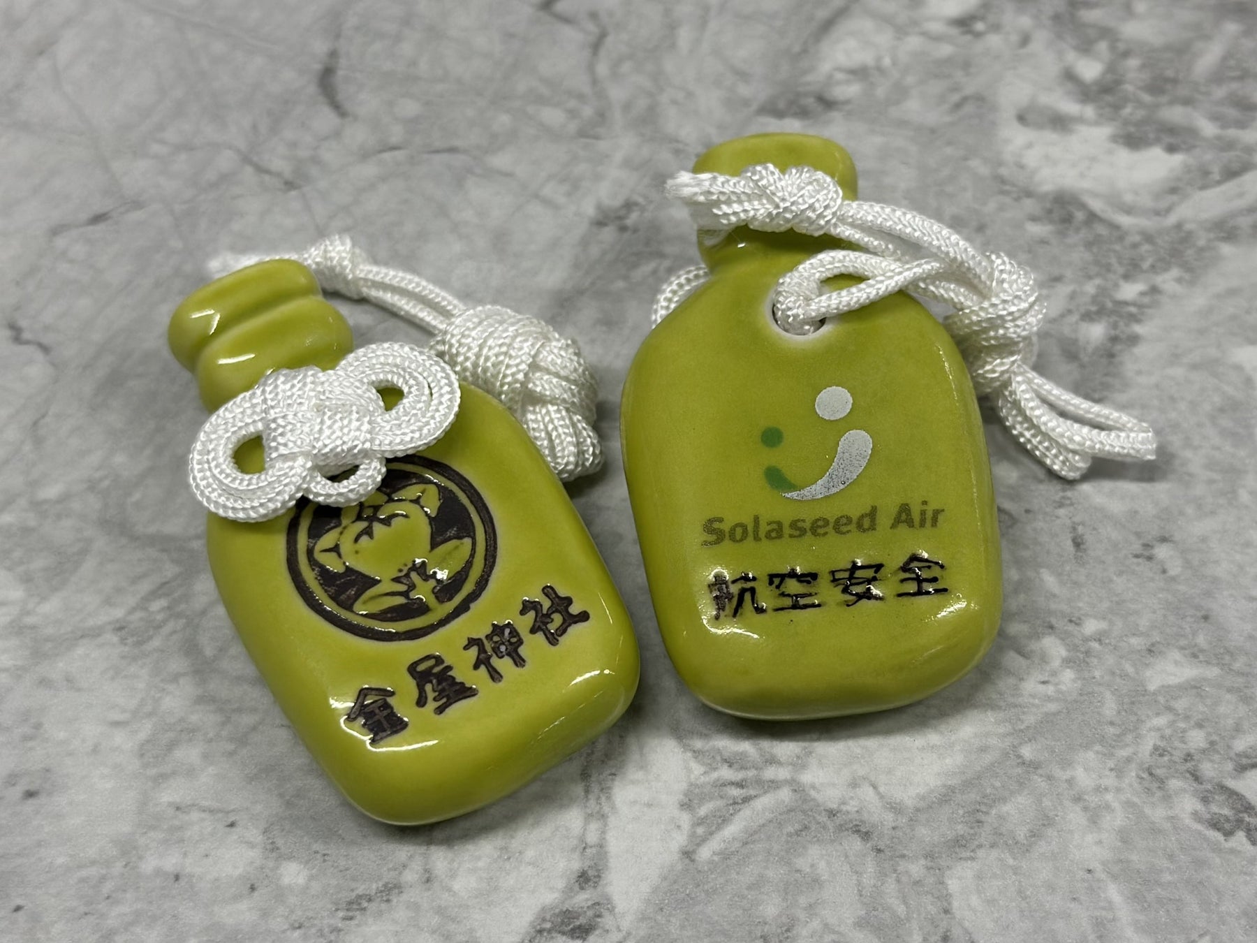 『このお守りは、株式会社和山様に製作いただき、金屋神社様(長崎県波佐見町) から特別に授与いただいたものです。皆さまの空の旅の安全を願うとともに、このお守りを通じて波佐見町の魅力に触れていただきたいという想いから選定しました。ソラシドエアのコーポレートカラーであるピスタチオグリーンで 「航空安全」 の祈願を施した特別仕様となっており、地域との温かい連携の証でもあります。』