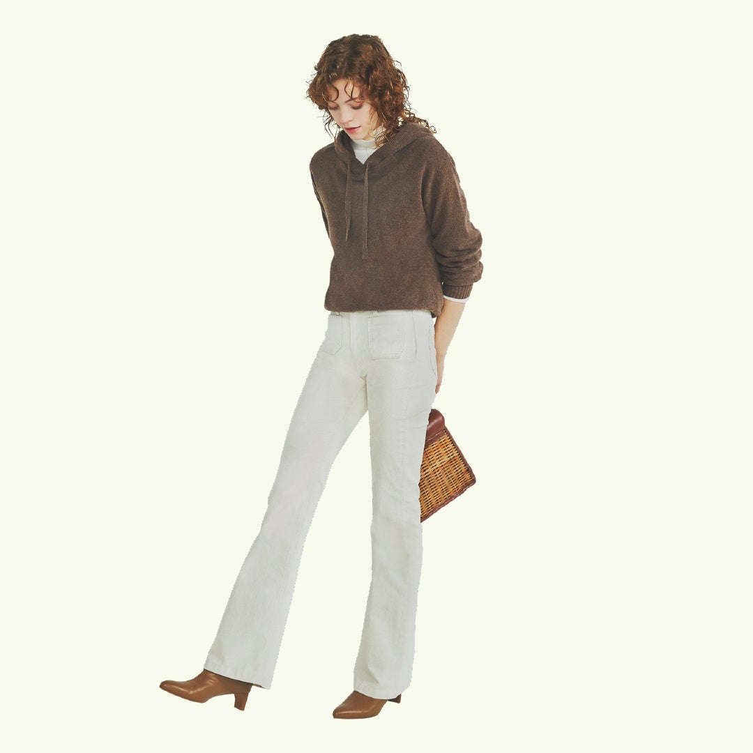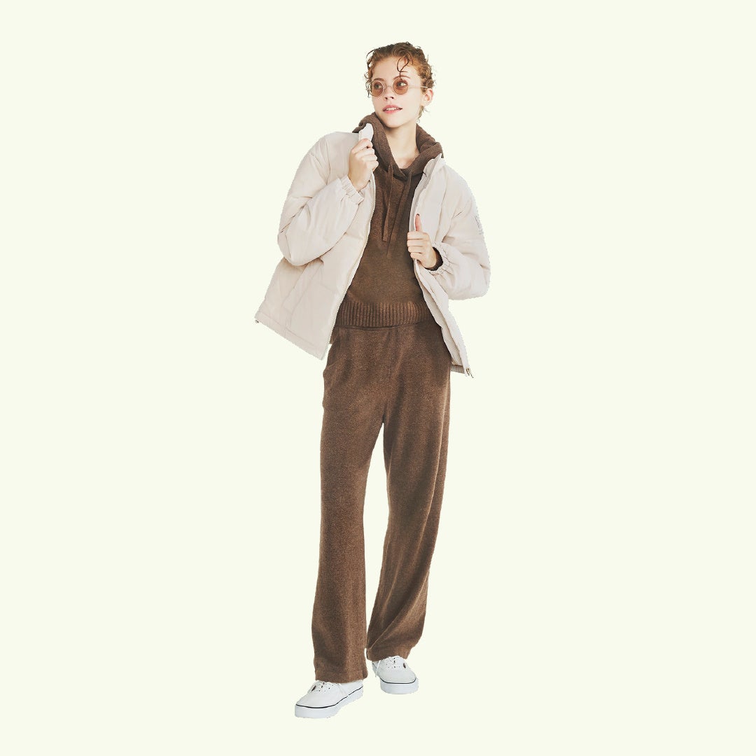 カシミヤのように、滑らかで柔らかい肌触りの上質な素材感と旬なブラウンカラーを、フーディで親しみやすく仕上げたデザイン。
