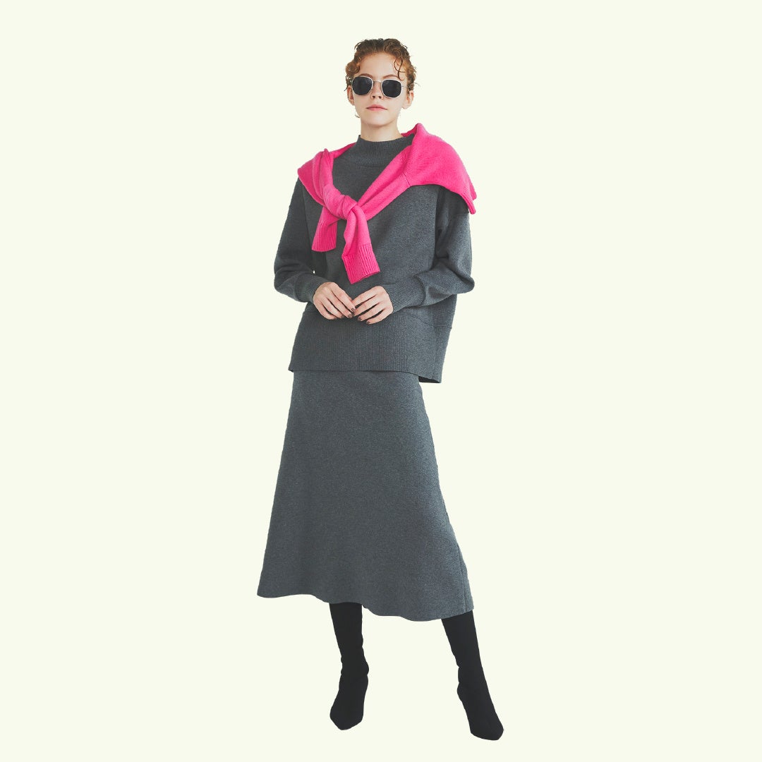 今季注目のピンクの中でも、誰もが憧れる高発色。立体感のあるネックラインのステッチと程よいつまり具合で、首まわりをキレイに見せてくれる。どんなボトムスとも相性の良いクロップト丈。
