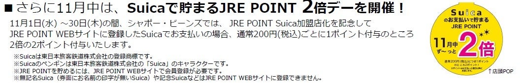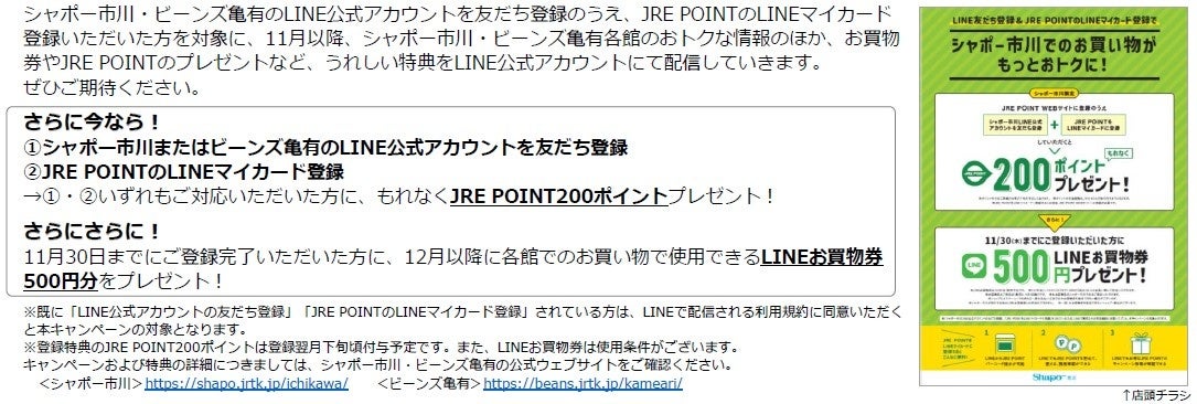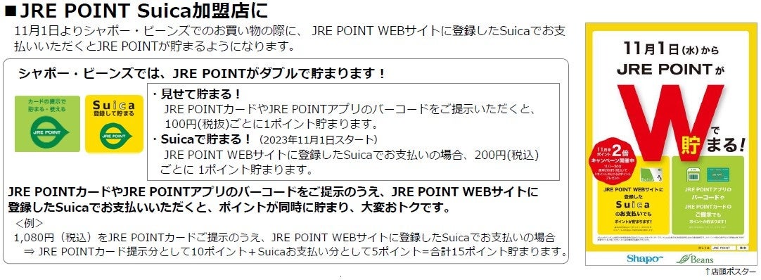 株式会社ジェイアール東日本都市開発が運営する駅のショッピングセンター「シャポー」「ビーンズ」では、毎日のお買い物をもっと便利に・おトクにご利用いただくため、11月から新たに2つのサービスをスタートいたします。