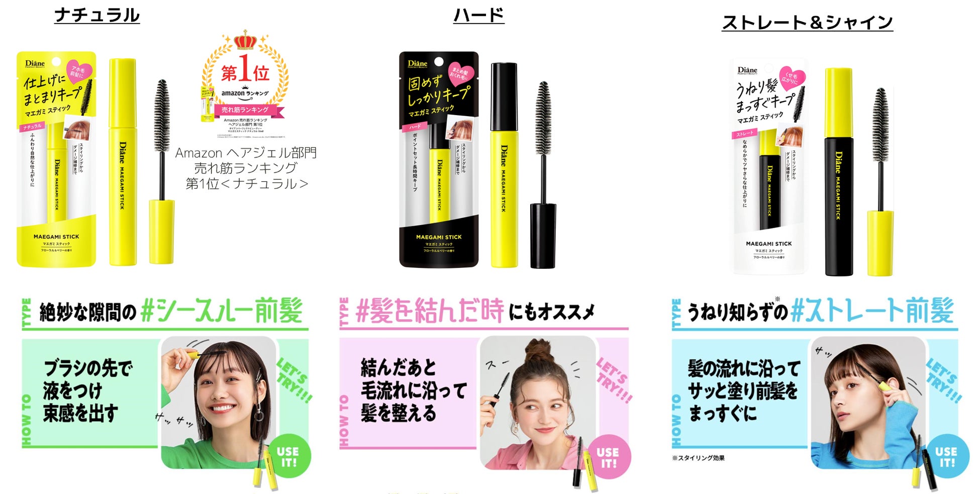 髪の状態は第一印象を大きく決めるとされ、ヘアケア商品も機能面が重要視されています。そんな中で昨年発売されたダイアン「マエガミスティック」は、ヘアスタイルをいつでも手軽にしっかりキープしたいという要望に応えた商品です。前髪はもちろん、アホ毛やまとめ髪の乱れ・おくれ毛も固めずにスタイリングでき、髪にツヤを与えながらダメージも補修。発売当初より多くの反響をいただいています。