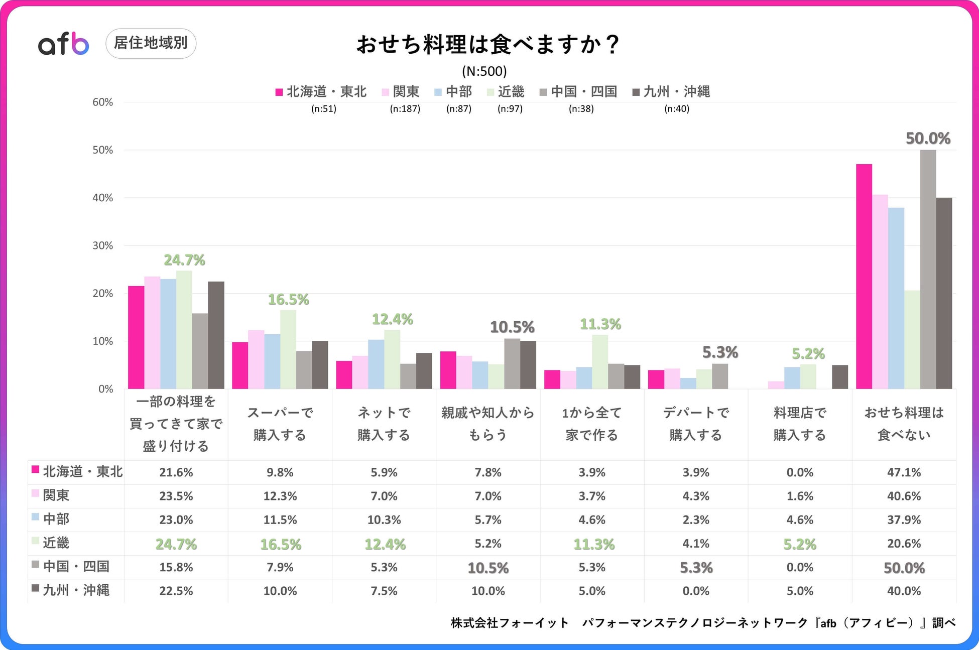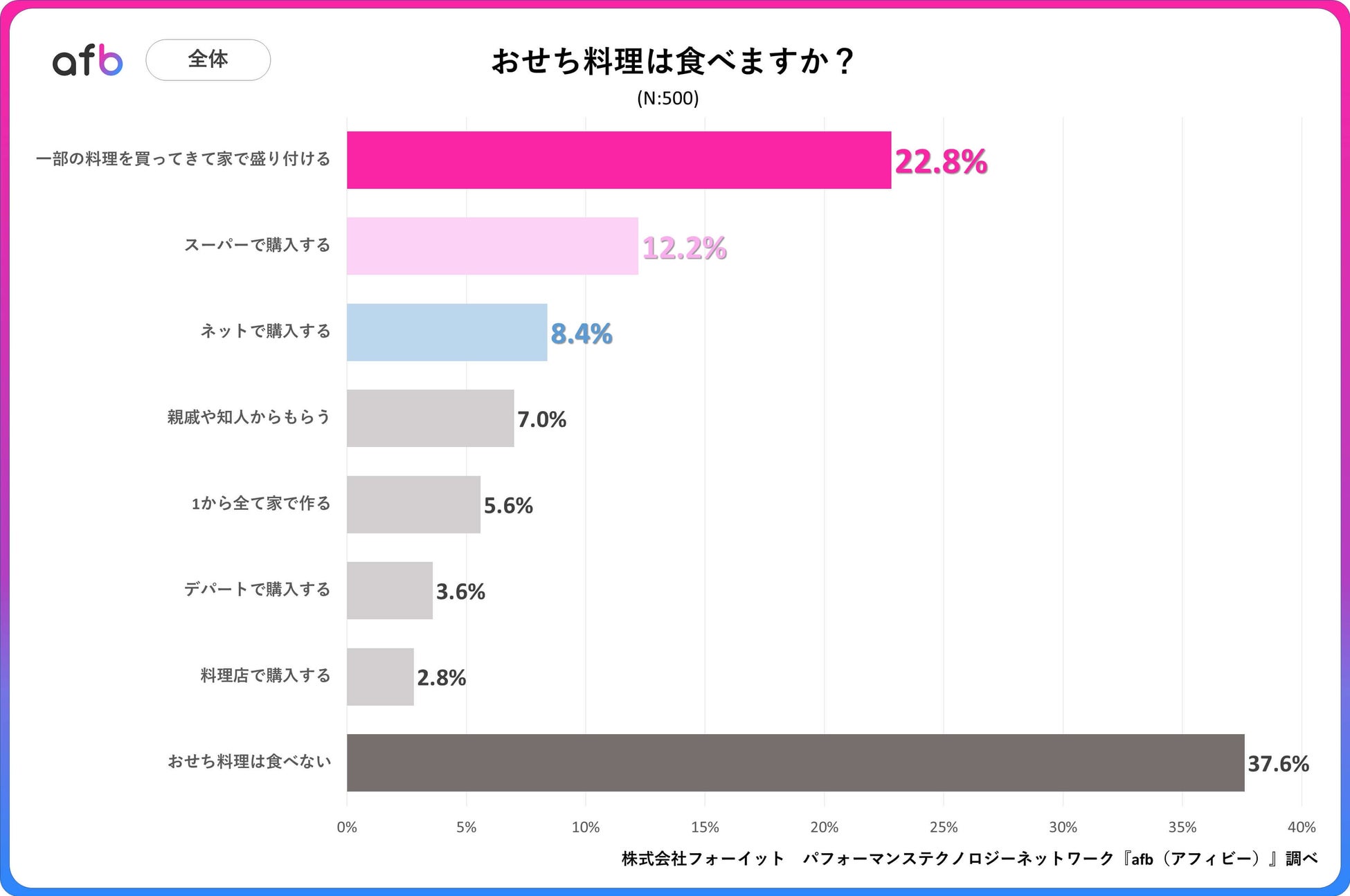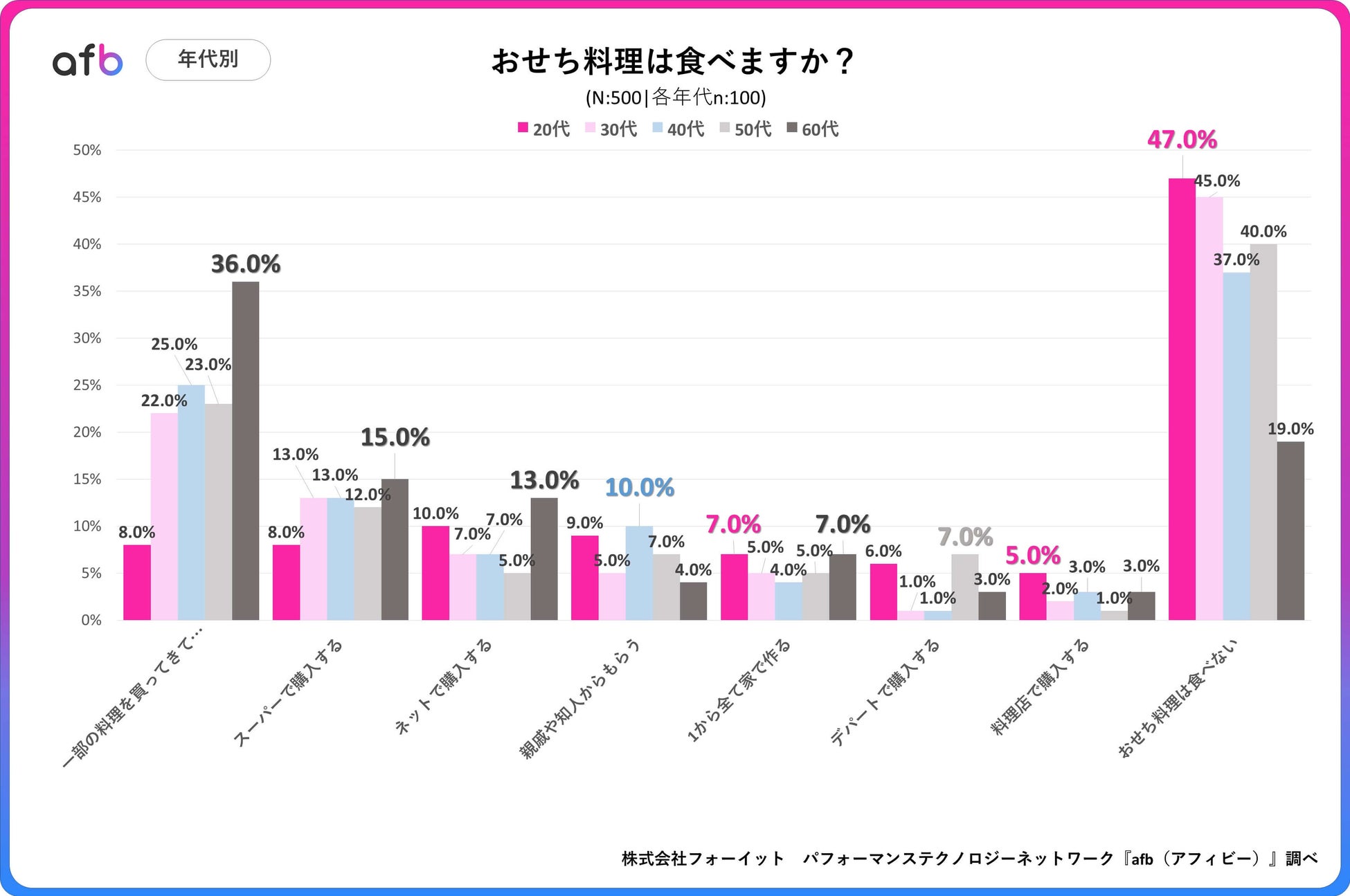 アフィリエイトプラットフォーム「afb(アフィビー)」< https://www.afi-b.com/ >の開発運用をおこなう株式会社フォーイットは、全国の20代~60代までの男女500人を対象におせち料理に関するアンケートを実施し、年代別等の特徴についてまとめました。