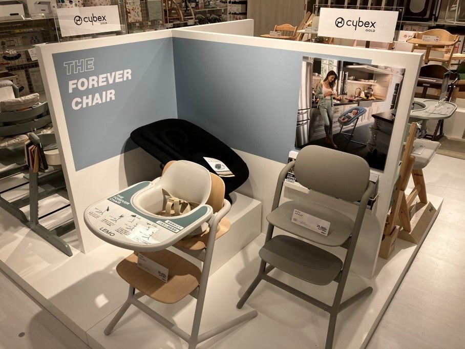cybexやSTOKKEなど様々な種類を展開しているチェア売場では、実際に座り比べができるためお子さまにぴったりのチェアが見つけやすい。