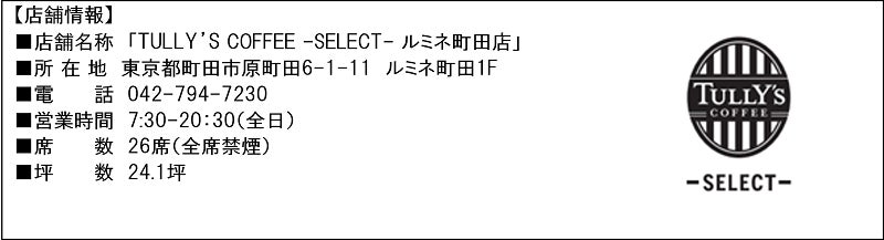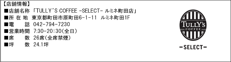 今回オープンする「TULLY’S COFFEE -SELECT- ルミネ町田店」は、ファッションビル「ルミネ町田」の1階に位置します。お買い物の休憩や、お仕事帰りに一息つける場所として、ぜひお立ち寄りください。