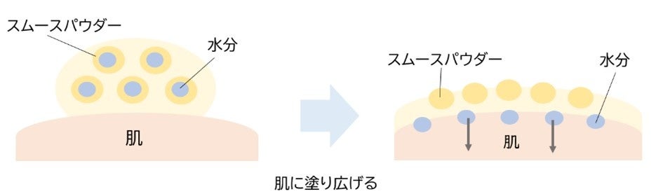 〇水分を抱え込んだスムースパウダー(アクリレーツクロスポリマーー2Na/基剤)が肌の上で弾けてあふれ出し、肌表面にサラサラな膜を作ります。