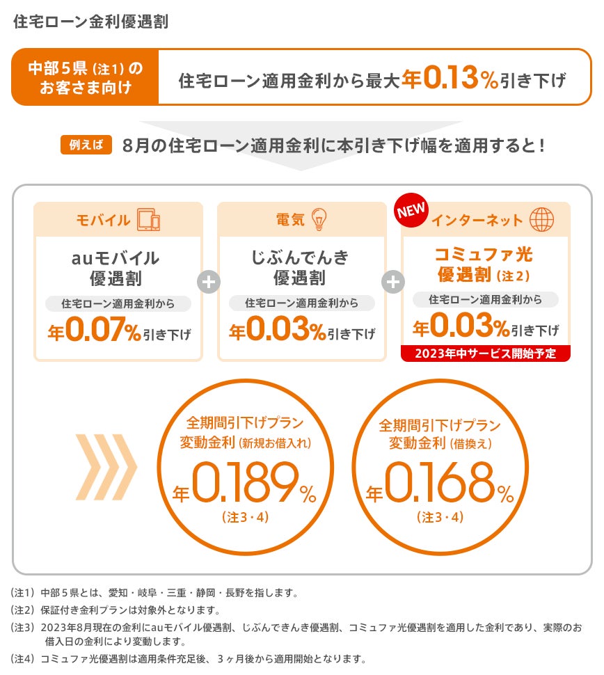 auじぶん銀行は、KDDIグループ内のモバイルと電気の契約者向けに「auモバイル優遇割」「じぶんでんき優遇割」※3を提供しています。これらと合わせて本サービスを適用することで、住宅ローンの適用金利が最大年0.13%引き下げとなり、中部5県※1においてネット銀行最低水準※2の住宅ローン適用金利を実現します。
