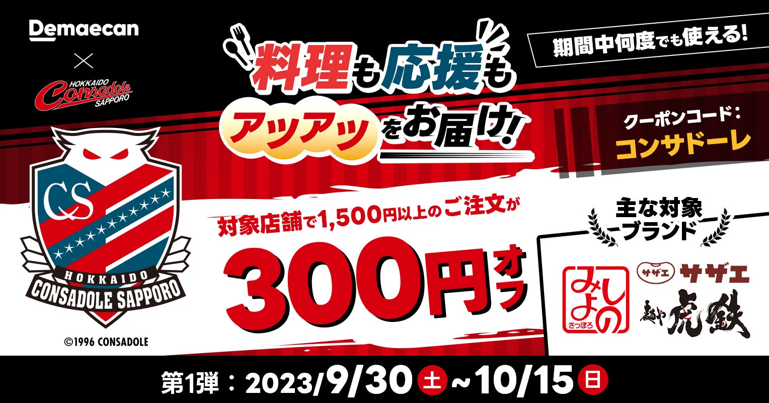 北海道エリアの対象店舗で1,500円以上のご注文時に何度でもご利用いただける300円オフクーポンを配布いたします。札幌民のソウルフード“ぎょうざカレー”を生みだした「みよしの」や、こだわりのラーメンとザンギが人気の「麺や 虎鉄」など、同じく北海道コンサドーレ札幌を応援するパートナー企業や地元の方に愛される飲食店を中心に、320以上の店舗でご利用いただけます。