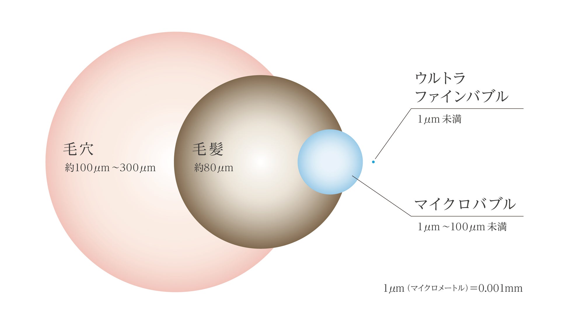 ウルトラファインバブルは毛穴の奥まで入り込んで汚れを取りのぞき、マイクロバブルが毛穴につまった大きな汚れを浮かせて取りのぞきます。