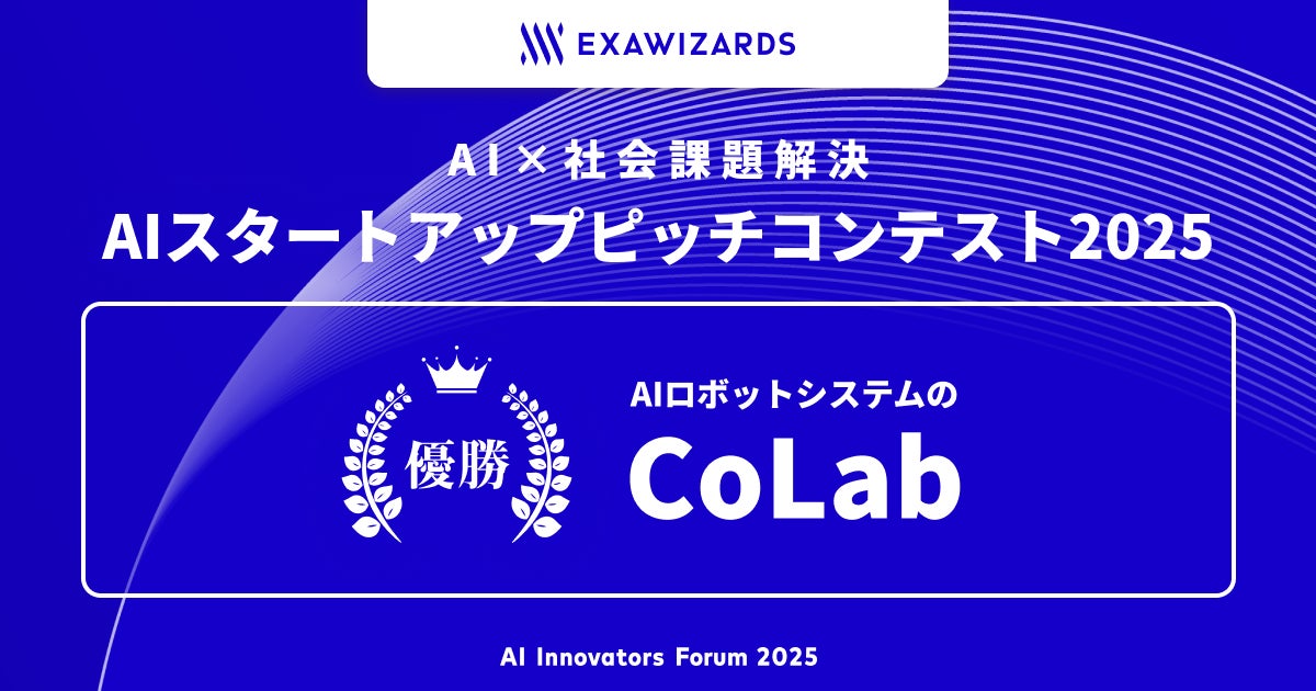 株式会社エクサウィザーズ(東京都港区、代表取締役社長CEO:春田 真、以下エクサウィザーズ)が10月21日に開催した、「AI × 社会課題解決」をテーマとしたスタートアップピッチコンテストにおいて、AIロボットシステムの株式会社CoLabの優勝が決定したので、お知らせいたします。