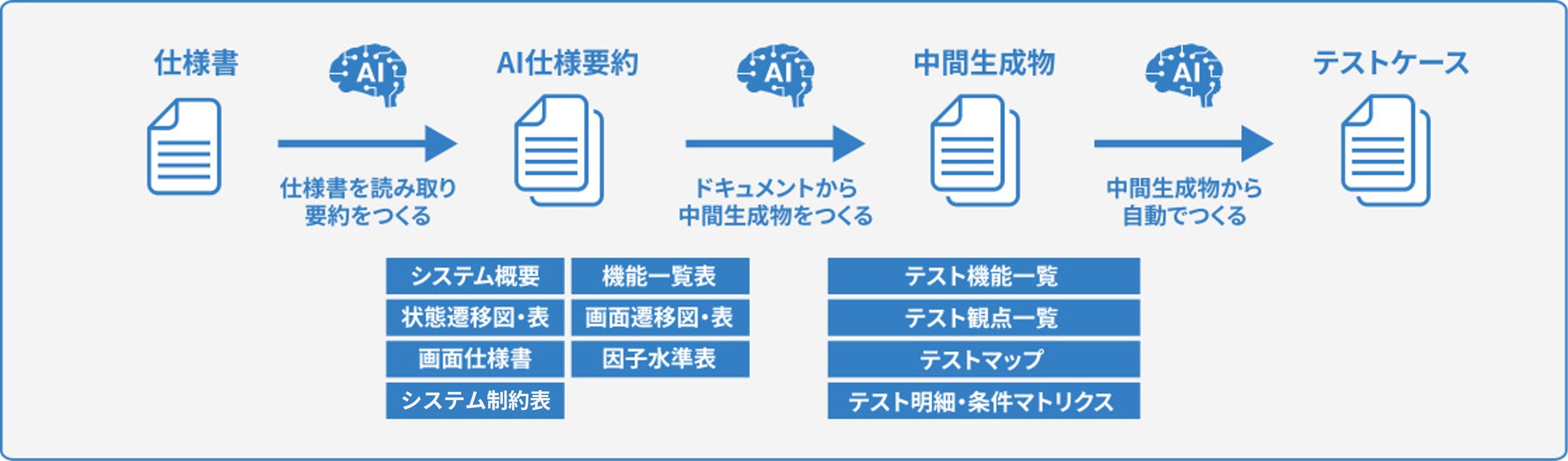 これにより、AI活用において求められる説明可能性を担保しながら、テスト設計の属人化を抑制し、設計品質の安定化と生産性向上を実現します。テスト資産の蓄積・再利用により、変化の大きい開発環境や複数案件にも柔軟に対応できるテスト体制の構築を支援します。