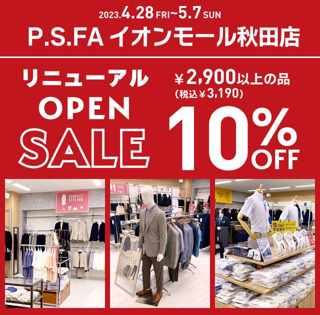 はるやま商事株式会社(本社:岡山県岡山市、代表取締役社長 中村 宏明)が展開するブランド、「Perfect Suit FActory(以下、P.S.FAと言います。)」(2023年3月末日時点 66店舗)は、P.S.FAイオンモール秋田店」を2023年4月28日(金)にリニューアルオープンいたします。