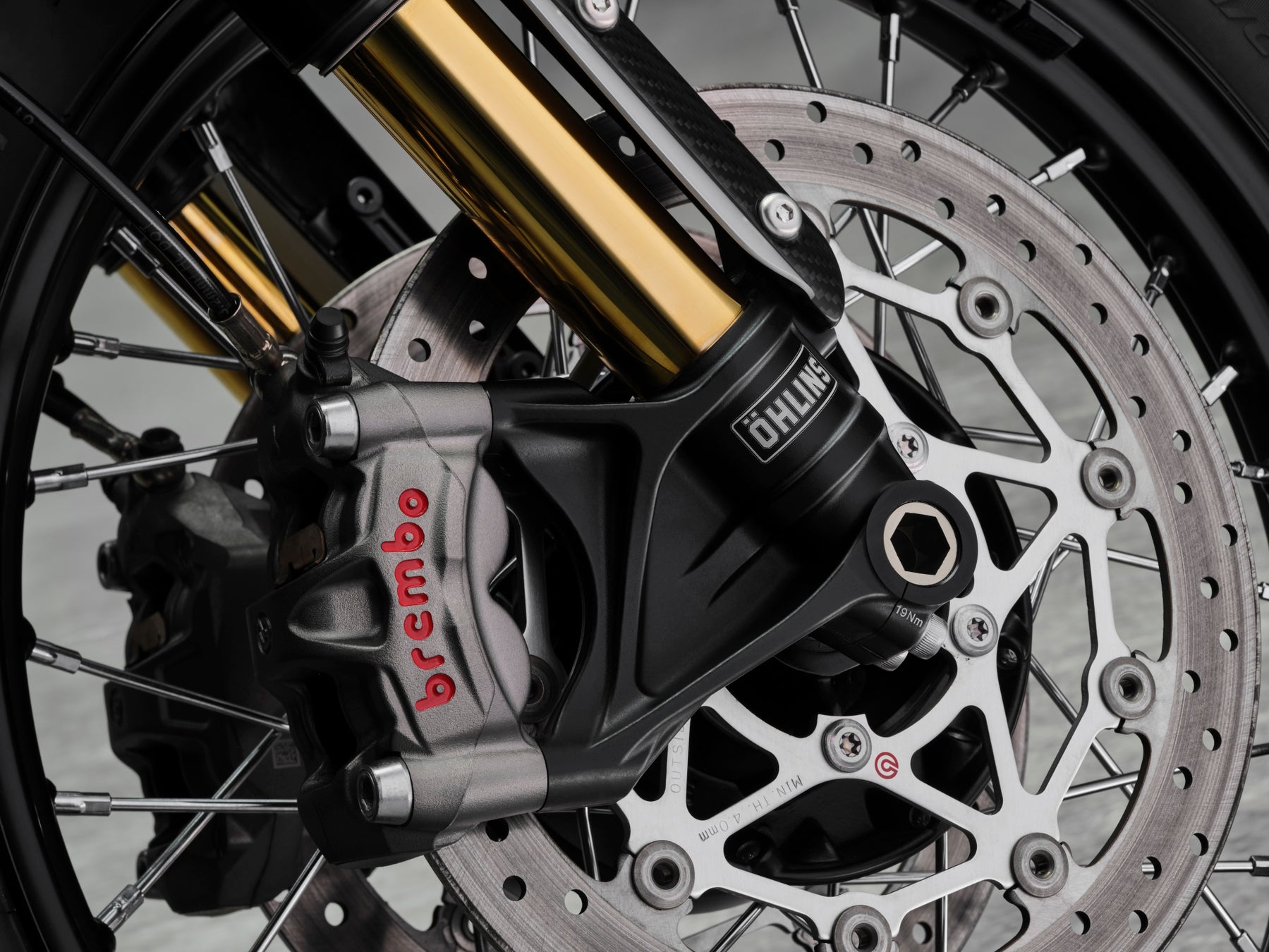 ブレンボ製M50ラジアルキャリパーと310mm径ディスクのツインブレーキシステムは、パワフルで応答性の高い制動力を発揮し、あらゆるコーナーで信頼性を確保。Öhlins製43mm径 NIX 30倒立フォークとリアショックは、スポーティで正確なハンドリングを実現します。