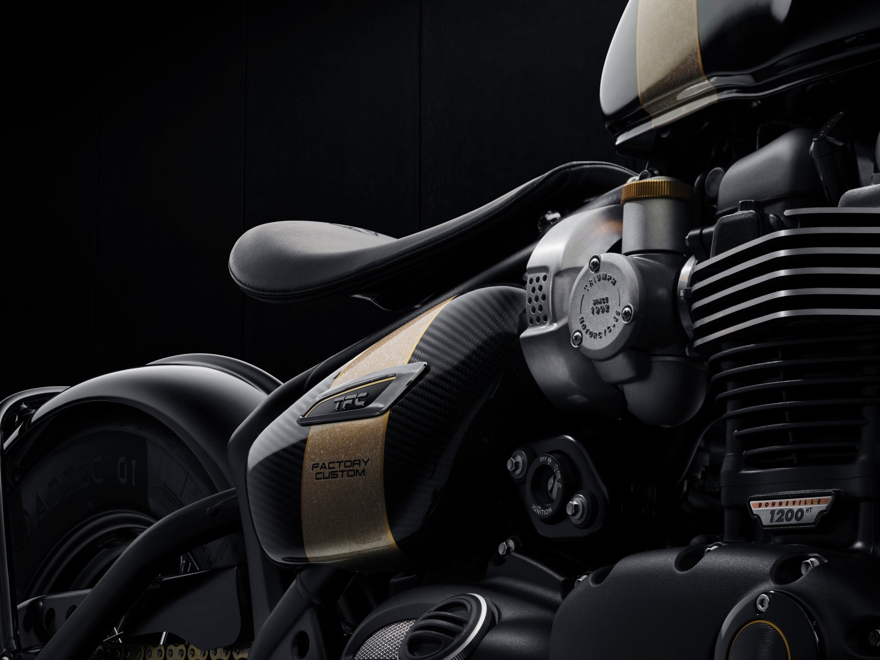 トライアンフの世界レベルのペイントチームが開発したデザインスキームを採用するBOBBER TFCは、ミニマルなタンクとサイドパネルに、ハンドペイントのマーブルゴールドテクスチャーのアクセントをあしらった、ユニークなツートンペイント仕上げで、見た目のインパクトを高めています。さらに、燃料タンクには、ペイントアーティストによる手書きサインが入っています。