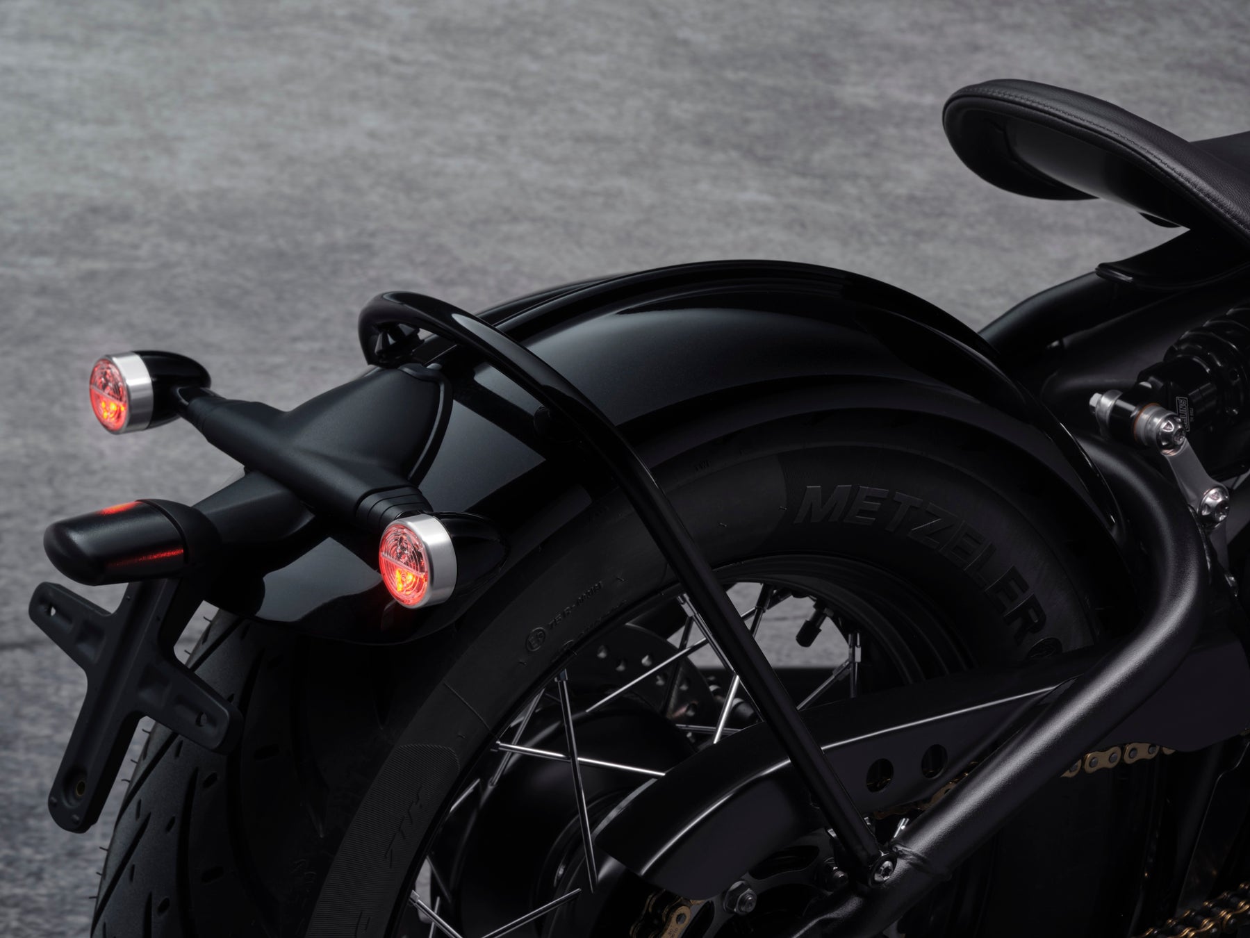 トライアンフのトライアングルロゴがエンボス加工されたブラックのプレミアムレザーシートは、快適性と特別感を提供します。このフローティングシングルシートとハードテールスタイルに隠れたRSUが、デザインの意図として感じられるボバー独自の存在感、すなわち筋肉質な車体のプロポーションを作り上げ、独特のスタイルが威厳のある走りを生み出します。