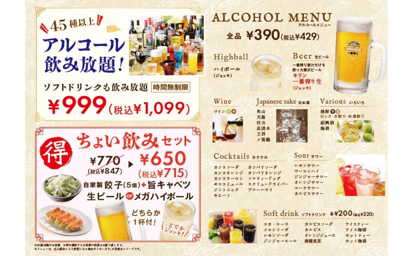 更に、ワイズなら、餃子との相性抜群のビールやハイボールなどのアルコールがすべて全品税抜390円(税込429円)!