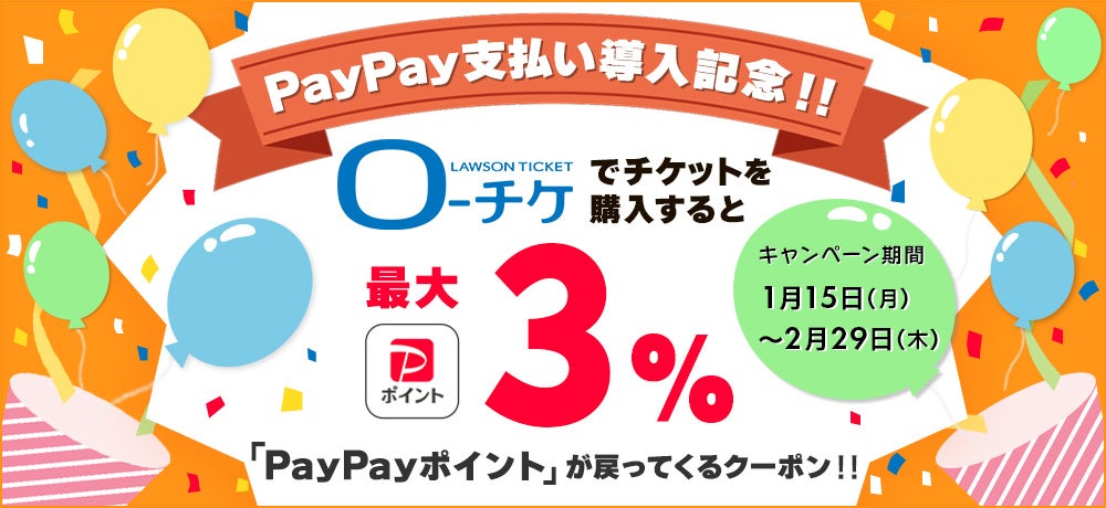 株式会社ローソンエンタテインメント(本社:東京都品川区、代表取締役社長:渡辺 章仁)は、2024年1月15日(月)から2月29日(木)の期間、運営する各種イベントチケットの販売を行うECサイト「ローソンチケット(以下、ローチケ)」にてご予約いただいたチケットのお支払い時に、PayPayアプリホーム画面よりクーポンを取得いただいた上でQRコード決済サービス「PayPay」を使用いただくと、「PayPayポイント」が購入金額の最大3%戻ってくるキャンペーンを開催いたします。