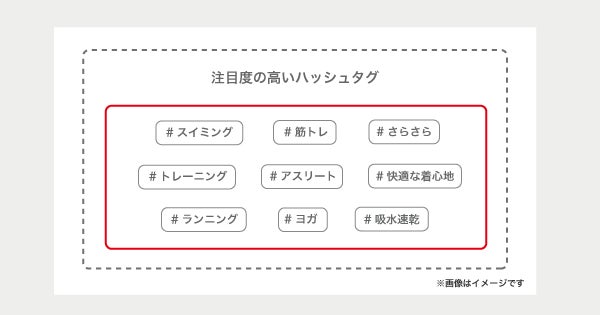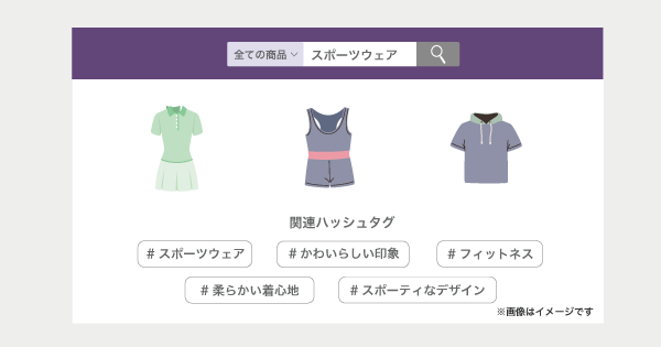 サイトトップページや検索窓に注目度の高いキーワードで生成されたハッシュタグを表示することで、ページ遷移のきっかけを与えセレンディピティを創出するほか、従来のカテゴリー分類を超えた商品検索により回遊率向上に貢献します。