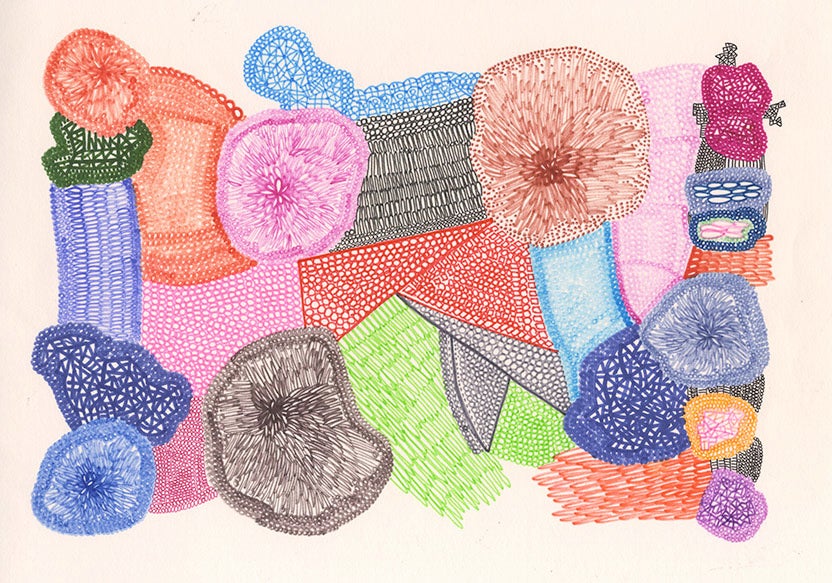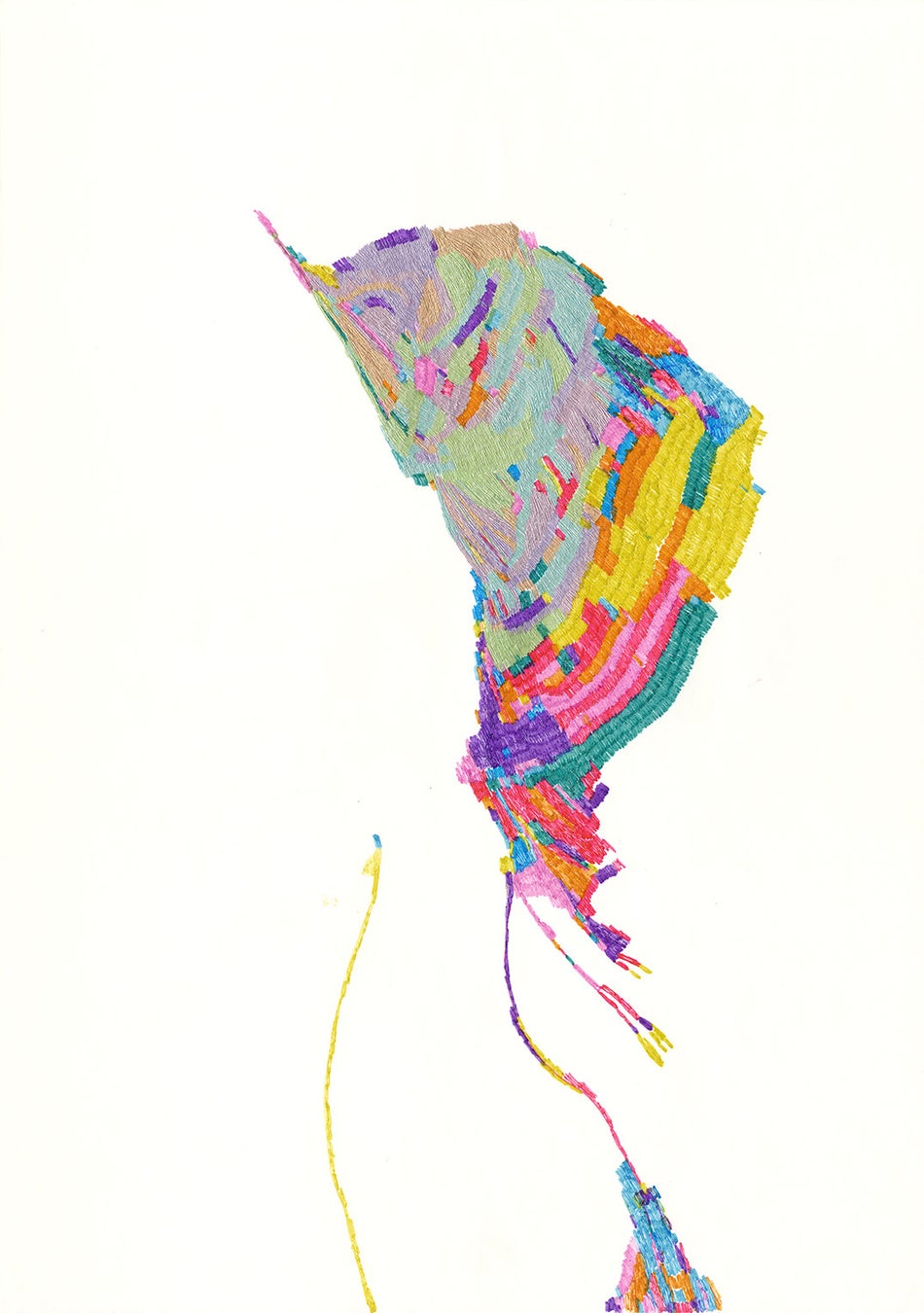 アトリエやっほぅ‼︎では、みんなのお姉さん的存在で、その時のきぶんで色鉛筆、水彩絵具、刺繍糸などを使い分けて自由な作品制作をしている。作品に登場する生き物や植物は可愛らしいものから作者本人にもわからない不思議なものまで様々。どの作品も優しさがにじみ出るカラフルな世界が広がっている。