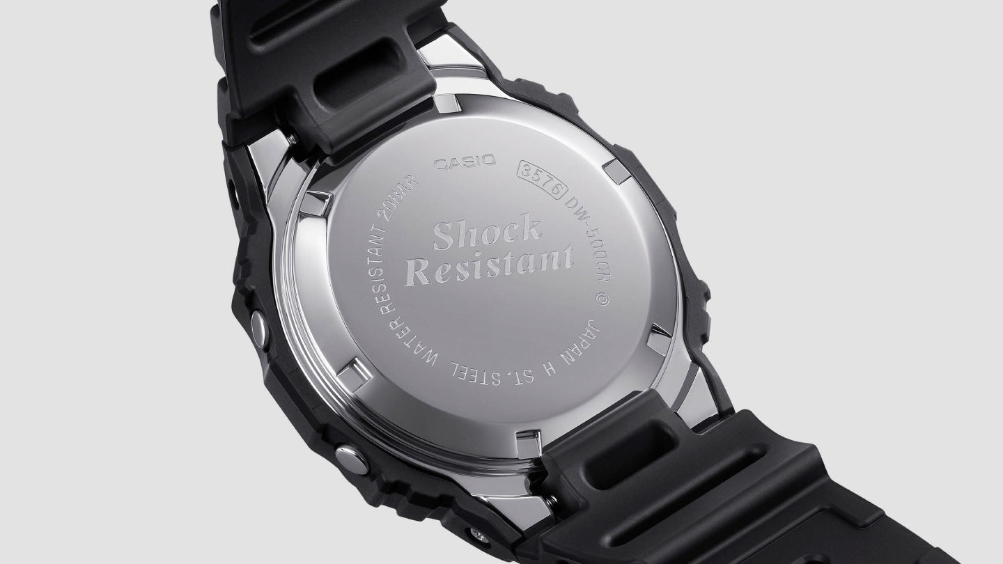 バンドは長さだけでなく、初号機に施されたバンド穴部分の凹凸形状、ディンプル※2の位置まで「DW-5000C」を踏襲。ベゼル上面の文字がある部分をフラットにした仕様や、フェイスの赤、青、黄色のカラーリングも同じデザインです。ステンレス製を採用したセンターケースや、「Shock Resistant」を刻印したスクリューバックなど細部に至るまでこだわりました。そして、『DW-5000R』は当時と同じく“G-SHOCK”のマザー工場である山形カシオで生産されます。