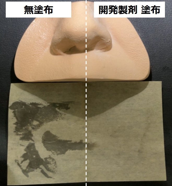メイクの仕上がり評価に用いる鼻モデルの全面に予め疑似皮脂を塗布し、その上から半顔のみに開発製剤を塗布しました。その後、加温することで皮脂が分泌した状態を再現し、外観とあぶらとり紙への皮脂の付着量から皮脂テカリ防止効果を評価しました。その結果、製剤塗布側はテカリが目立たなかったうえ、あぶらとり紙でもほとんど皮脂が付着せず、皮脂テカリ防止効果に優れていることが分かりました(図1)。