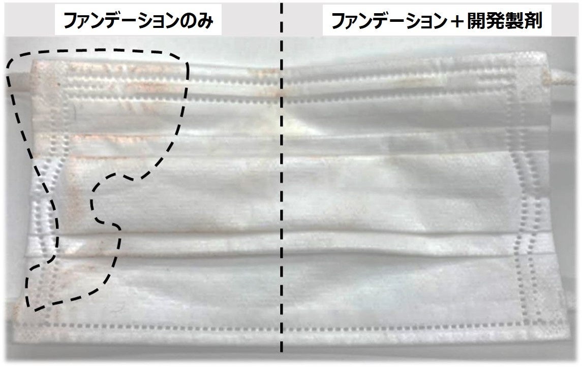 試験参加者の全顔にリキッドファンデーションを塗布後、半顔にのみ開発製剤を塗布し、不織布マスクを着用した状態で4時間経過した後のマスクへの色移りを評価しました。その結果、製剤塗布側ではほとんど色移りがなく、マスクによるこすれに強いことを確認しました(図2)。