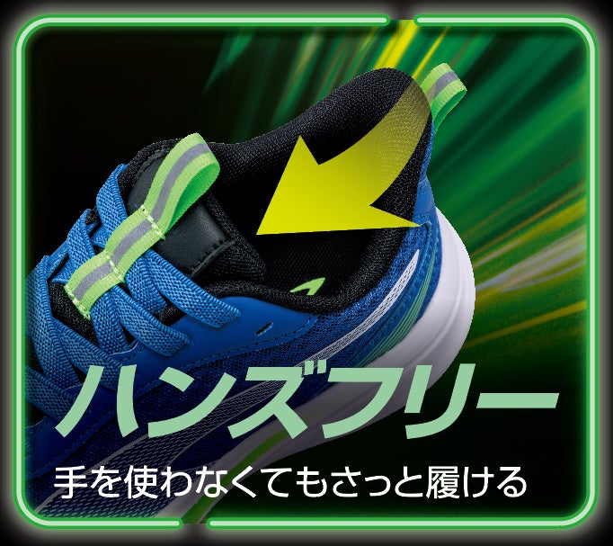 一般的なシューズでは、慌てて靴を履くことが多いお子様がかかとを踏み潰す姿が多く見られます。それを受け、本商品には手を使わずに着用できるハンズフリー機能を搭載しました。紐を結ぶ手間はなく、素早く履いてすぐに走り出すことが可能で、且つ、かかとの踏みつぶし防止にもつながる便利な機能です。さらに、お子様の健やかな成長のため、ゆったり履いていただける幅広設計(3E相当)のジュニア専用足型を採用し、安定感と普段履きとしての履き心地の良さにもこだわりました。