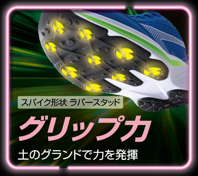 お子様が校庭や屋外で運動する際、グラウンドが土でできていることが多くありますが、本商品は、地面との接地面であるアウトソールにスパイク形状のラバースタッドを採用。土のグラウンドでもしっかりグリップし、滑りやすい環境でもお子様の安全かつ力強い走りをサポートします。