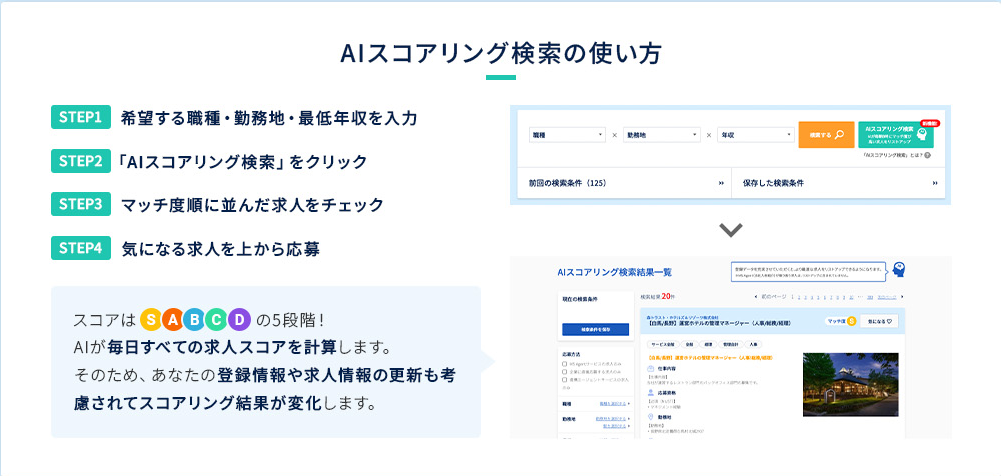これに対して、当社が管理部門・士業特化の転職エージェント(人材紹介)事業で培った、最適な求人を選別するノウハウをAIに活用して、求人検索機能に組み込むことで、最適な求人と効率的に出会える体験を提供するために「AIスコアリング検索」を開発致しました。