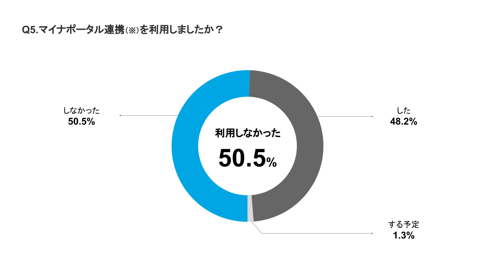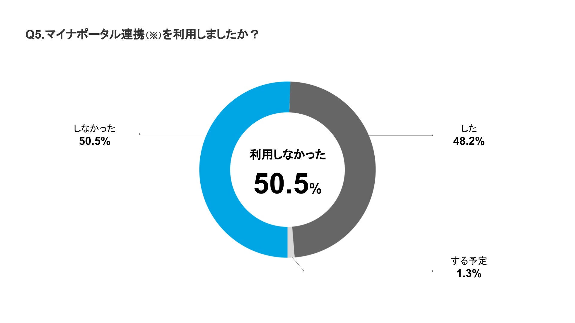 「利用しなかった」理由については、40.1%が「事前準備が手間だった」、17.4%が「マイナンバーカードを持っていない」、15.7%が「マイナポータル連携を知らなかった」、14.9%が「申請内容がマイナポータル連携の対象外だった」と回答。事前準備の手間でマイナポータルの申請を約半数が利用をしなかったが、利用しなかった理由を鑑みると、連携の事前準備の簡素化やマイナンバーカードの普及率向上などの影響により利用率は増加すると考えられる。