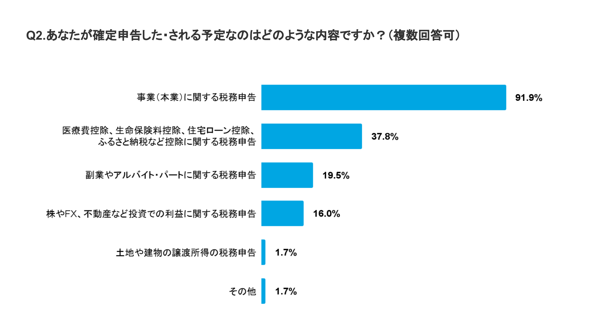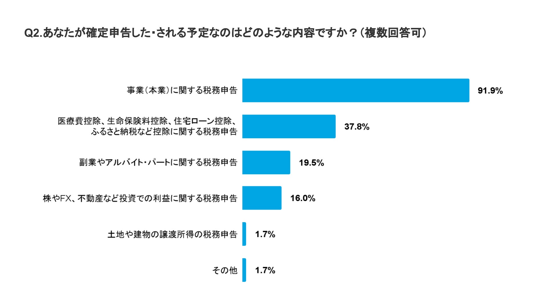 調査回答者の99%は確定申告を実施し、1%はこれから行う予定だと回答。確定申告内容としては、「事業(本業)に関する税務申告」が91.9%で最も多く、次いで「医療費控除、生命保険料控除、住宅ローン控除、ふるさと納税など控除に関する税務申告」が37.8%と、昨年と比較しても順位や割合に大きな変動はなかった。
