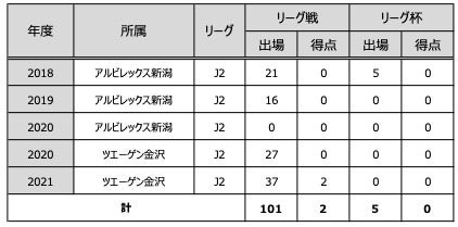 J2リーグ 101試合(2得点) / リーグカップ戦 5試合(0得点)