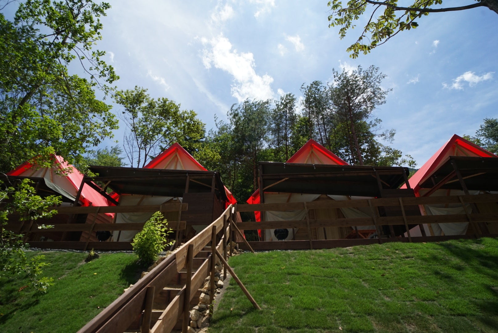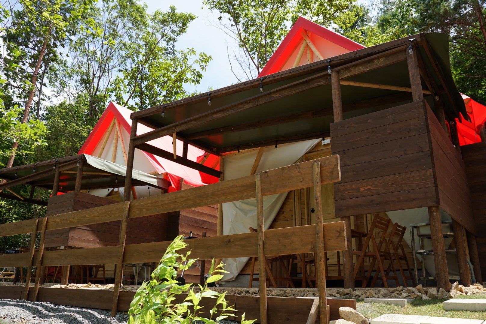 ご宿泊棟は、木々の緑に囲まれた赤い屋根の大型テント、別荘気分を味わえるコテージの2タイプをご用意。