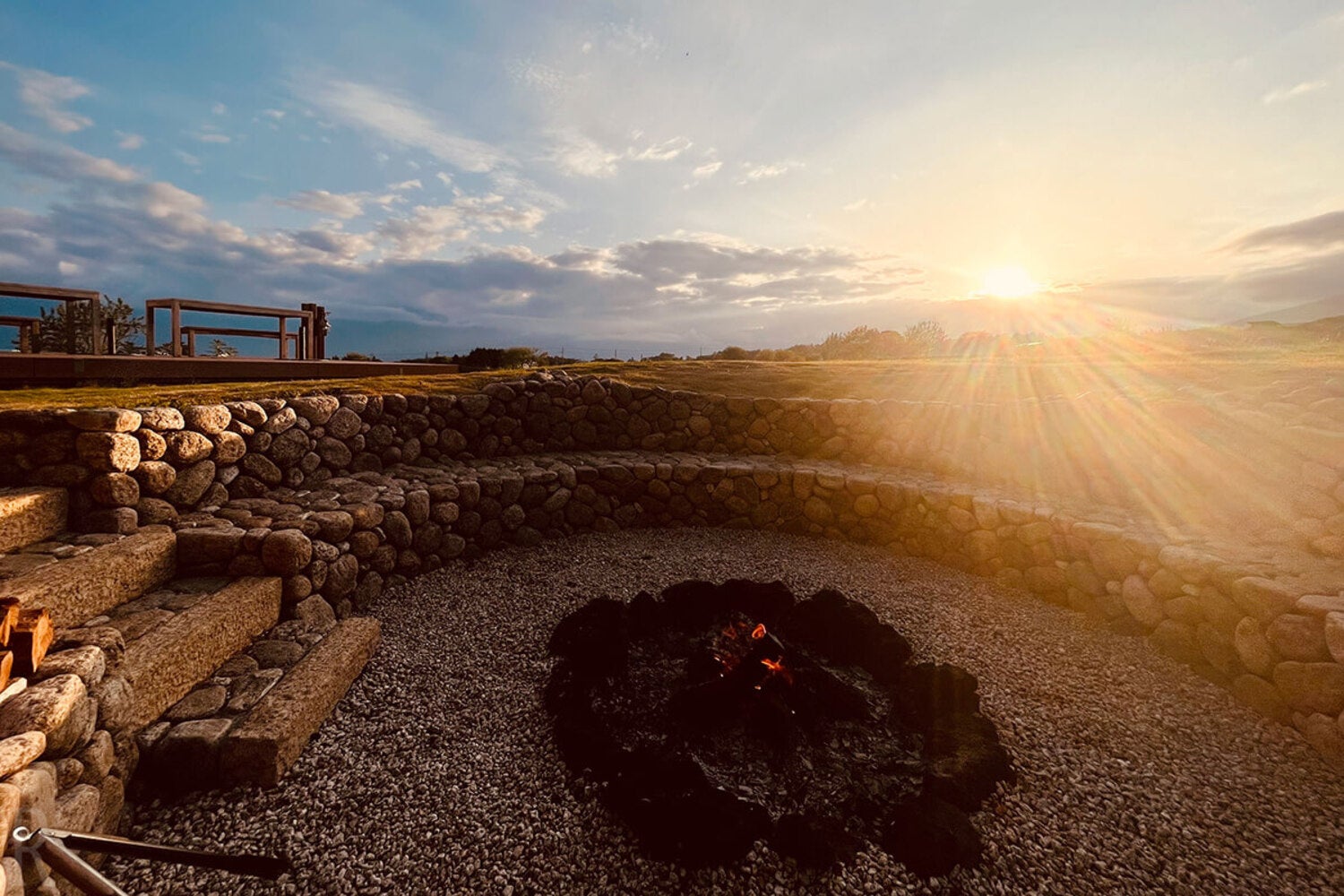 日本伝統の石積み職人による本格的な竪穴式アンダーグラウンドファイヤーピットが生み出す炎と夕日と農場と空のコントラストが織りなす唯一無二の極上空間。