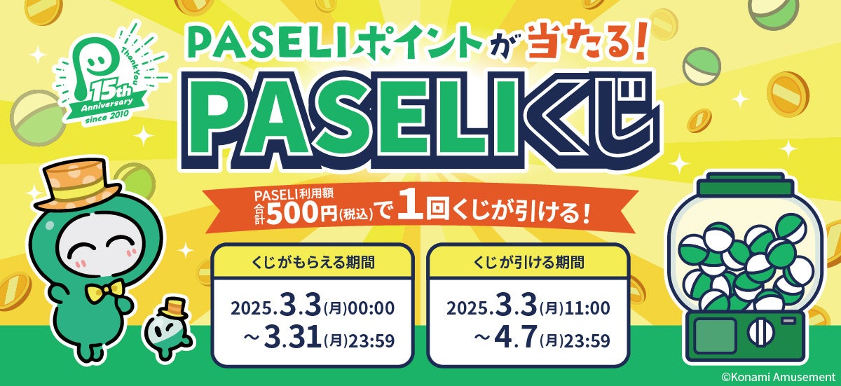 15周年を記念して、PASELIポイントが当たる抽選に参加できるキャンペーン「PASELI15周年記念!PASELIくじ」を3月3日(月)から開始します。
