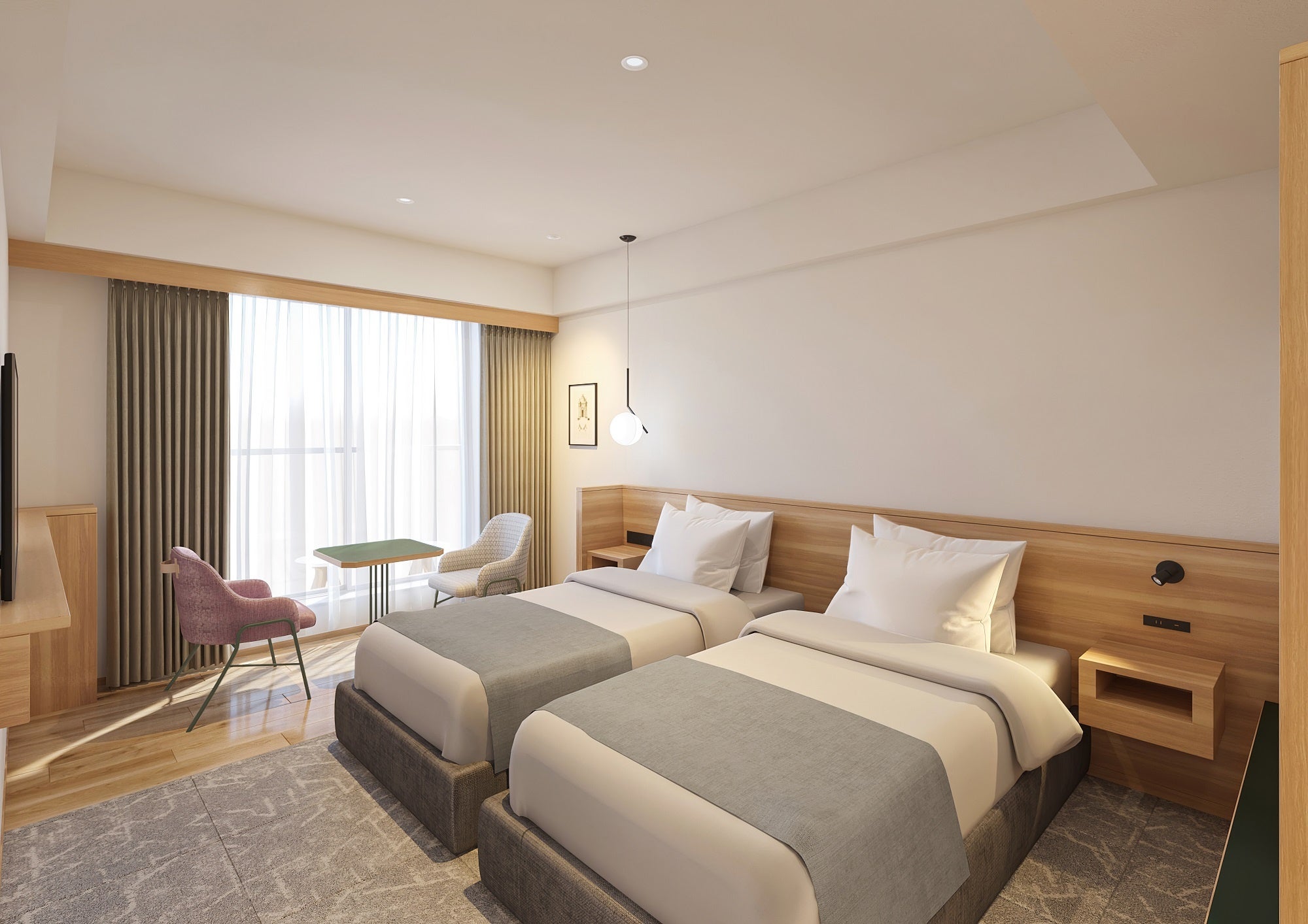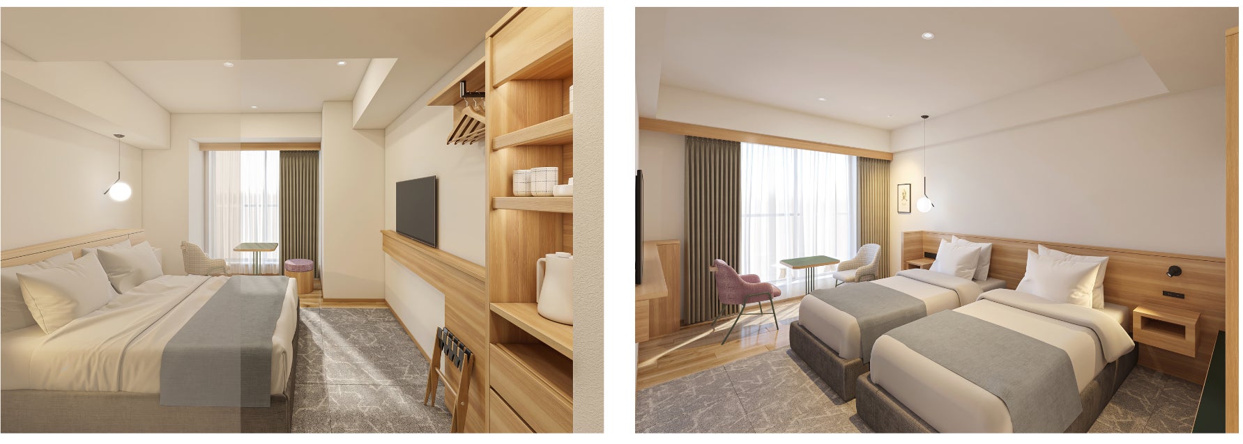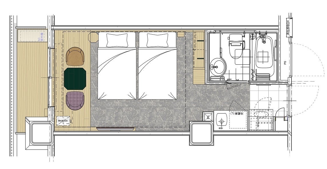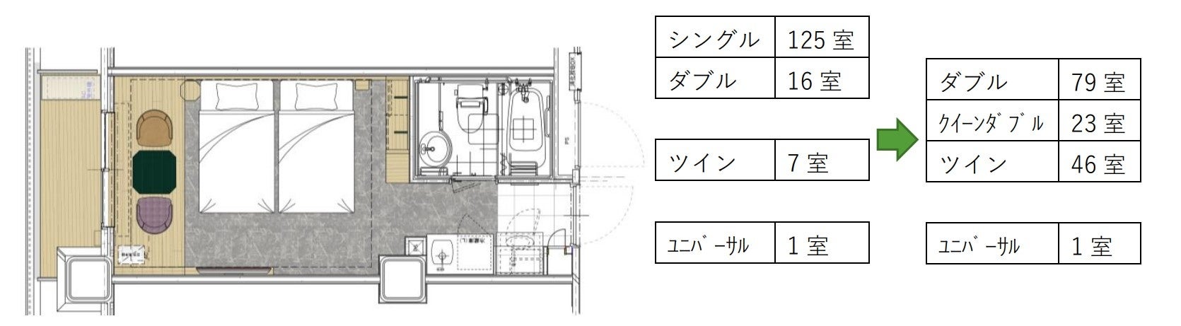 全149室中125室を占めていたシングルルームをダブルルーム(1400mmベッド)・クイーンダブルルーム(1600mmベッド)・ツインルームに転換、全室2名様以上でご利用いただけます。従前7室のみであったツインルームは46室に増強、高層階には3・4名対応の客室をご用意しております。一部の客室はバルコニーと一体化したレイアウトとしており、客室面積以上のゆとりや開放感を感じていただけます。