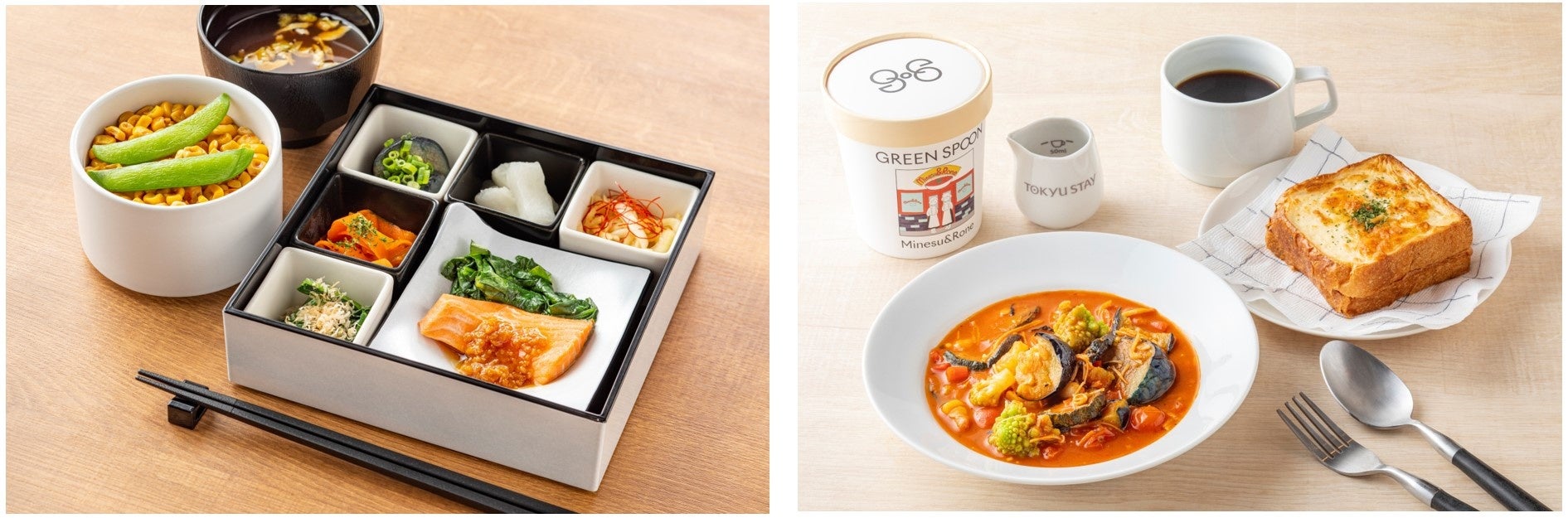 お部屋で楽しめる朝食スタイル「ステイモーニング」と題し、客室内の電子レンジで簡単調理が可能な、和洋選べる朝食スタイルをご用意いたします。客室内のプライベート空間で、自分時間でゆっくりと朝食をお楽しみください。 こちらの朝食にはリターナブルな耐熱容器を採用。東急リゾーツ&ステイ株式会社で推進しているSDGsブランド「もりぐらし®」の取り組みの一環として、使い捨てプラスチック製品の削減や食品ロスの軽減などを通じ、地球環境への配慮を実現してまいります。