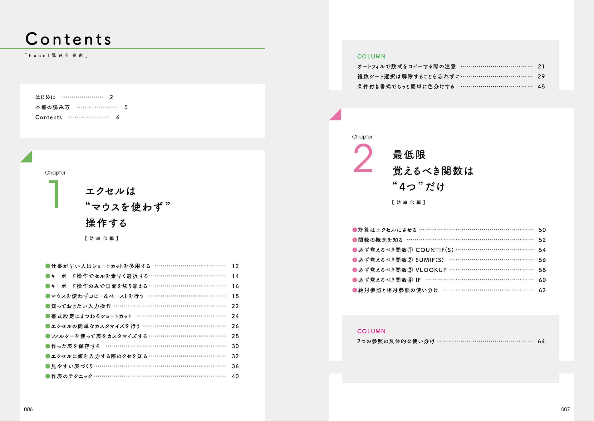「Excel驚速仕事術」は、デロイトトーマツコンサルティングにて新入社員向けのExcel研修を担当する著者が実戦で編み出したデータ分析の技法を解説する1冊です。本書では、作業効率アップと時短のためにマウスを極力使わないキーボード主体のExcel操作法や、ほぼ4つの主要な関数だけを使って効率的にデータベースを構築する方法などを豊富な図版とともに説明します。