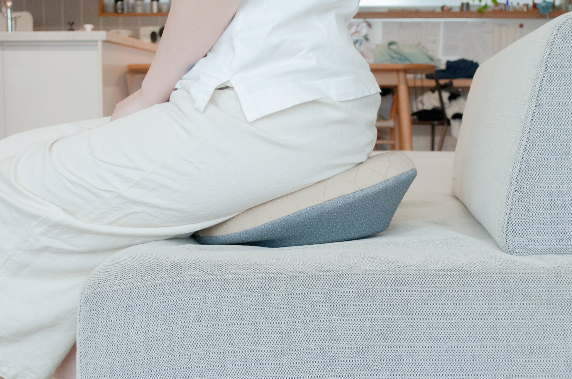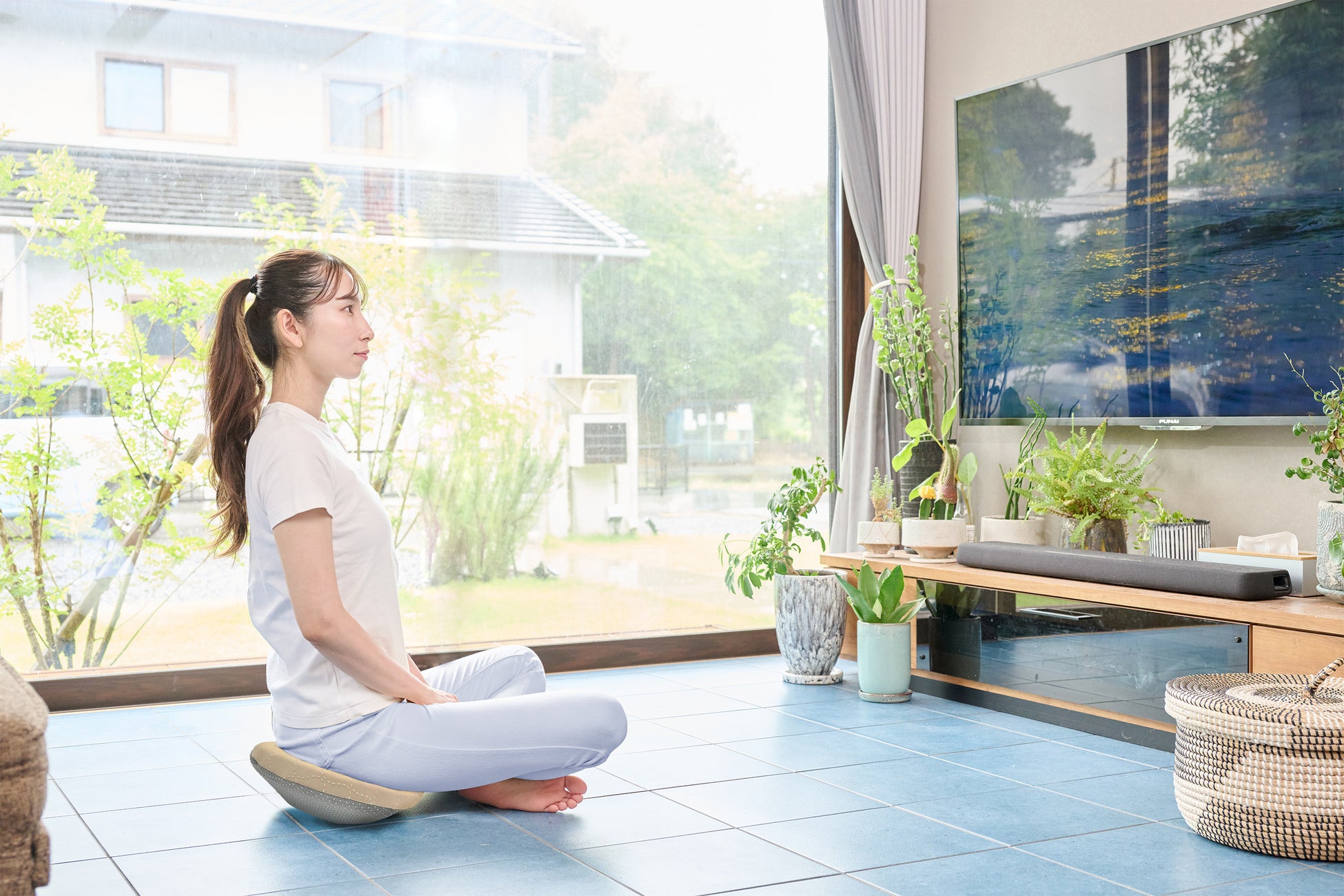 ダイニングチェアやオフィスチェアなどさまざまな椅子に置いて使用できます。座って動かすだけなので仕事中や動画を観ている際にも「ながら運動」が可能です。使わないときには背もたれクッションとしても使用できます。床に座ってあぐらをかくと、クッションが前に傾き、背筋が伸びた姿勢(骨盤を前屈させた座り方)を促します。