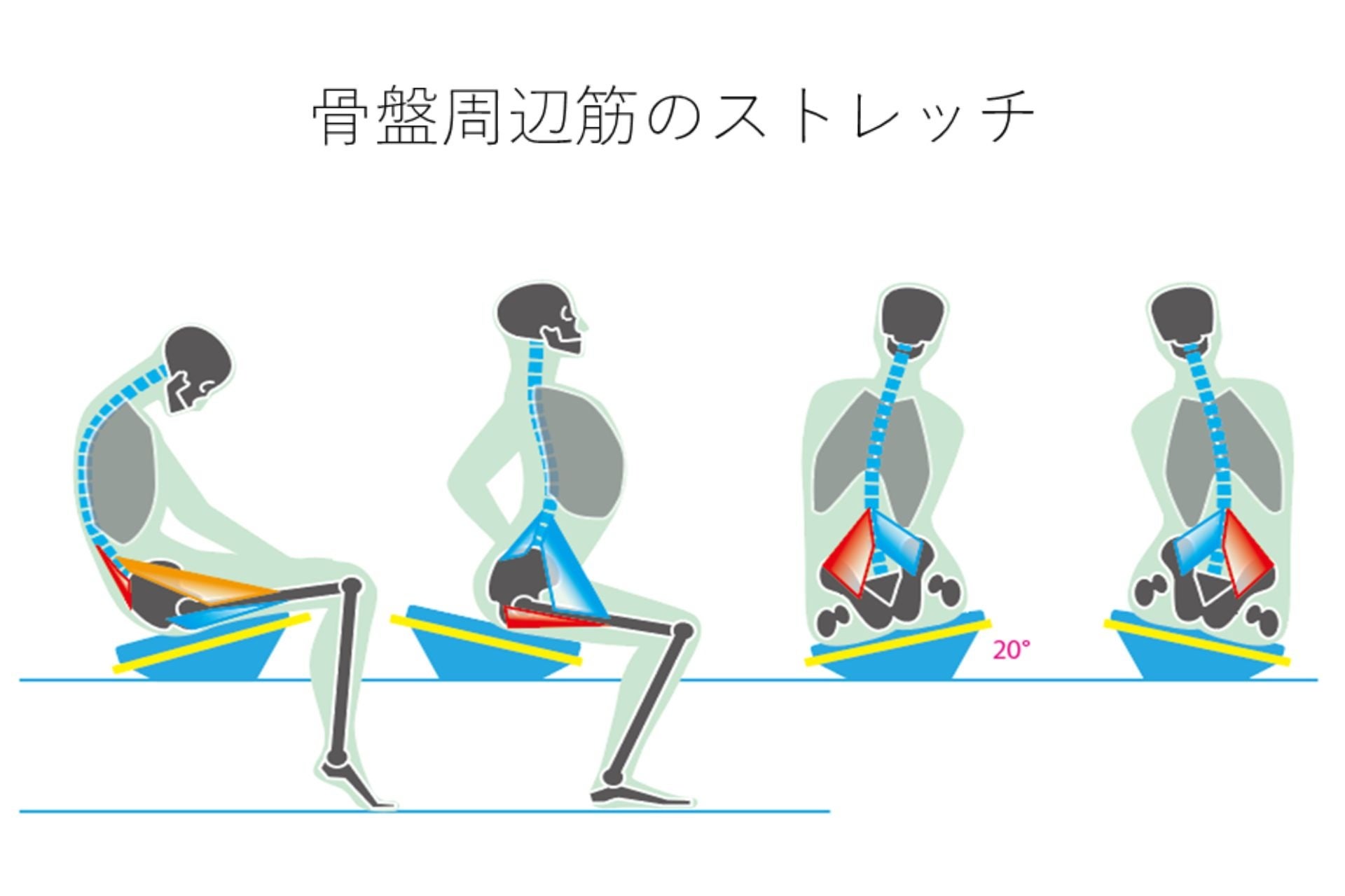 座った状態で前後、左右、回旋の動きをするだけで、簡単に骨盤周りの筋肉を使った運動ができます。オリジナルの構造により前後、左右どの方向にも滑らかに動きます。