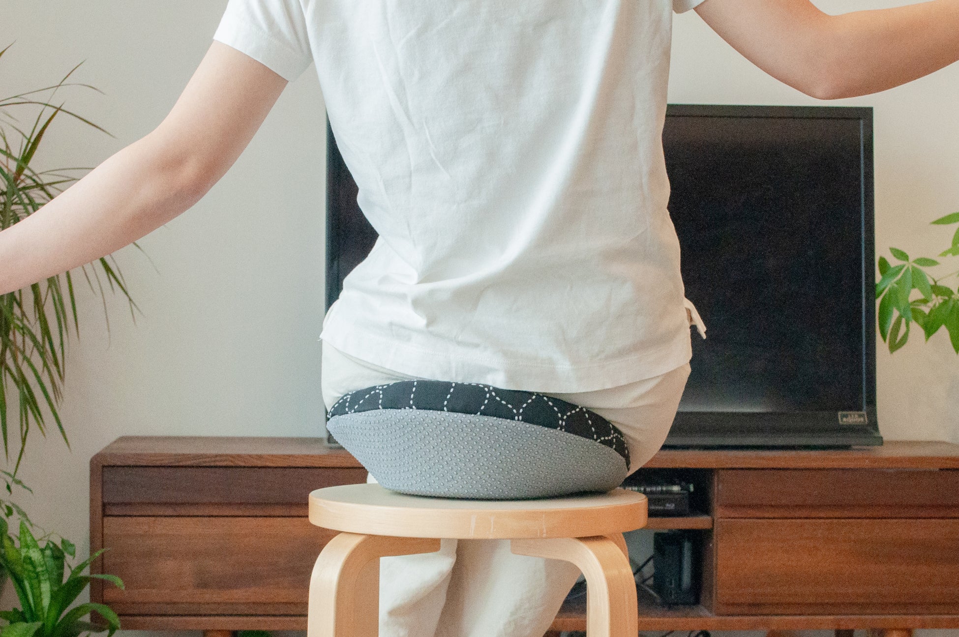 ローリングクッションをイスの上に置き、クッションの前寄りに座るだけで自然と背筋が伸び(仙骨が前傾し)、背骨のS字カーブを作る意識をサポートします。