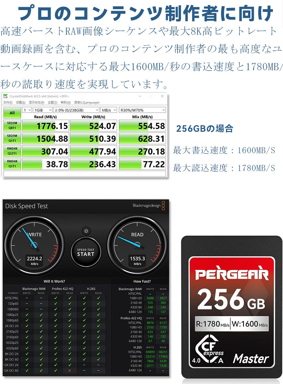 ●Pergear CFexpress 4.0 Type A メモリカードは、最新の USB4.0 インターフェイスを採用し、1780MB/秒の驚異的な読み取り速度と 1600MB/秒の書き込み速度を実現し、最も要求の厳しい 4K および 8K ビデオ録画や、高解像度の RAW 画像の連続撮影にも対応します。