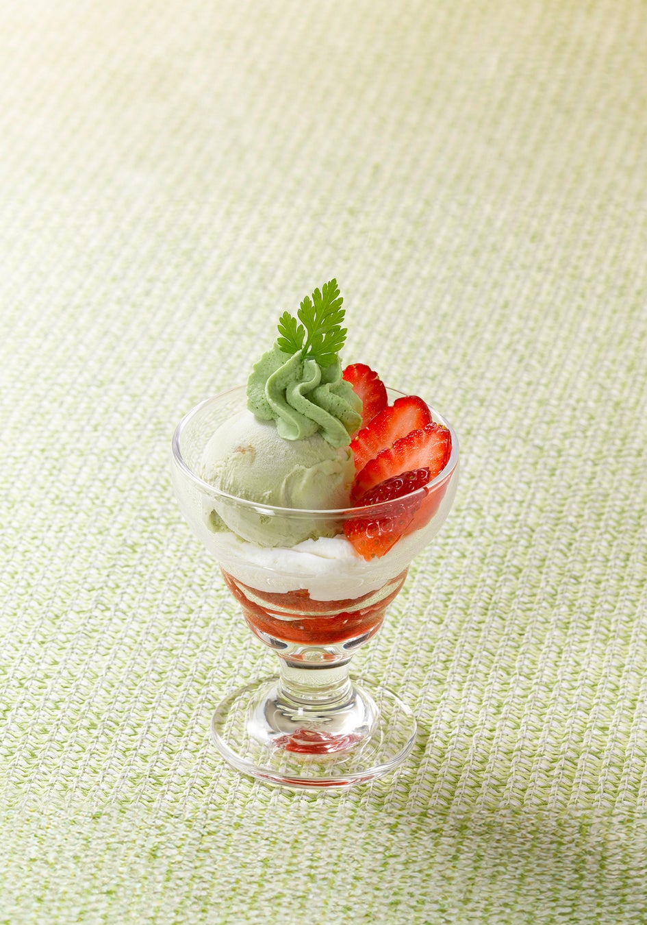 お食事のあとに少しだけ召し上がりたい方へちいさなパフェをご用意いたしました。苺とピスタチオアイスクリーム、ピスタチオクリーム、ホイップクリームを合わせたプチパフェ。お食事の締めくくりに、旬を楽しむデザートをどうぞ。