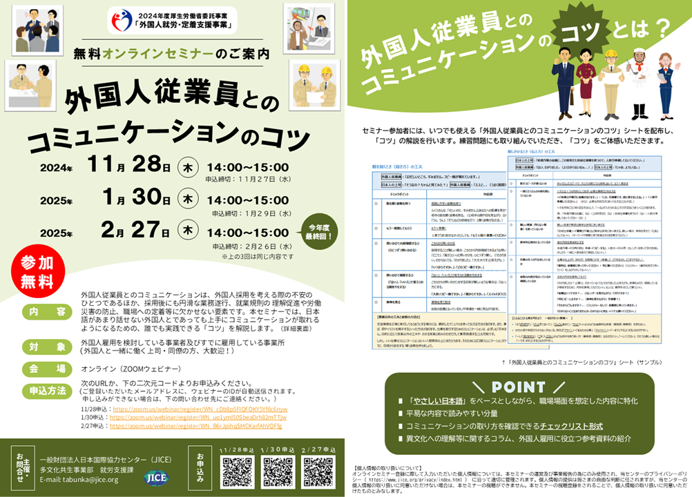 ※本セミナーは厚生労働省が実施する「外国人就労・定着支援事業」の一環として実施します。