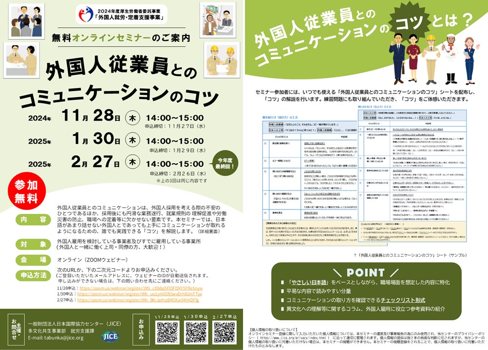 外国人材採用・定着支援オンラインセミナー「外国人従業員とのコミュニケーションのコツ」を実施します(参加費無料、短時間から参加可能)