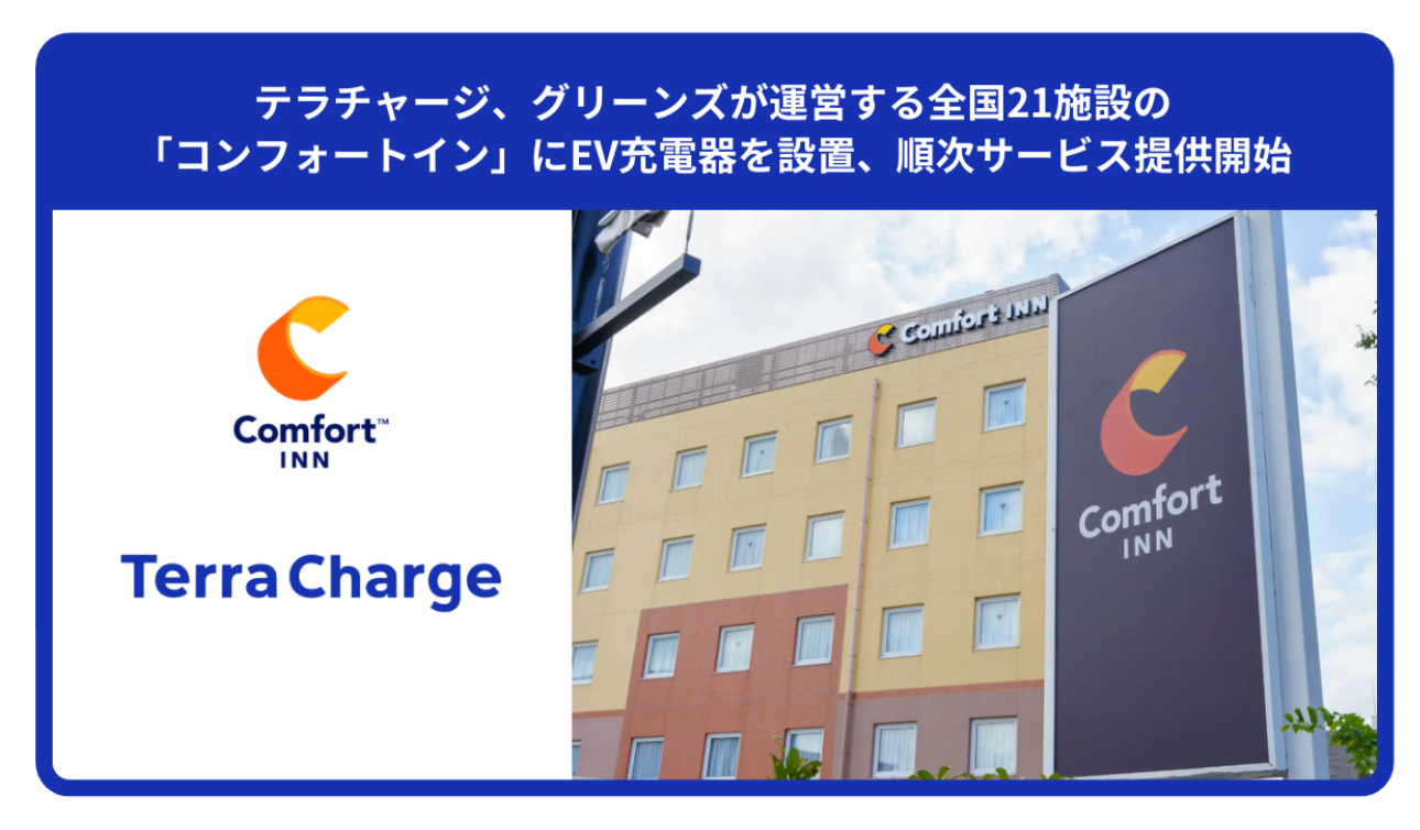 Terra Charge株式会社(本社:東京都港区、代表取締役社長:徳重 徹、以下「当社」)は、グローバルブランド「コンフォートホテル」を中心に、60 年以上のホテル運営実績を有する 株式会社グリーンズ(本社:三重県四日市市、代表取締役社長:村木 雄哉)は運営する快適性と機能性を重視した宿泊特化型ホテル「コンフォートイン」全国21ホテルにおいて、6kW普通充電器を各施設に4基ずつ、合計84基を設置し、順次サービス提供を開始することをお知らせいたします。
